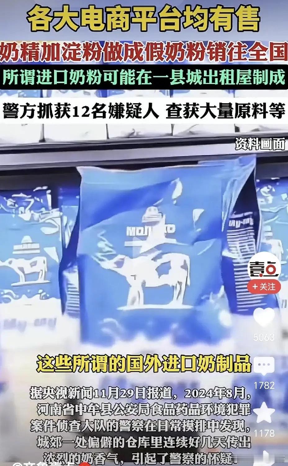 太可恨了!奶精加淀粉做假奶粉卖向全国!近日根据媒体报道,警方查获了一起假奶粉案,抓捕了12个嫌疑人,这些人采用淀粉做假奶粉,疑似谎称是进口奶,各大电商平台都有,然后卖向全国,这下被警方抓获,等待他们的将是法律严惩。这些人也是胆大包天,奶精加淀粉就做出来了假奶粉,并且疑似按照进口奶售卖,而且在电商各大平台都有售卖,这样的假奶粉跟真奶粉营养成分差别巨大,卖出去那么多,大概就不知道坑住多少人了,这样的做法可以说极其恶劣,而对这些人也应该严惩不贷。现在我国电商发展越来越好,不少商品都在电商平台售卖,而且卖的也相当好,而且由于取消了中间商,电商平台价格也相当合理,这样一来,很多人都愿意在电商平台买东西,这样不仅仅价格实惠一些,而且可以送到家门口,也非常方便了。这样一来,民众享受到了更多质优价廉的商品,也促进了民众消费,让大家的获得感更好了。但是现在也有一些胆大包天的,就像是这样做假奶粉的,可能也盯上了电商平台,而对于这些人,日常大概也要加大监督力度,同时也要加大打击力度,加大这些人的违法成本,这样这些人大概才不敢胆大妄为了。而且由于奶粉非常特殊,不少家庭都会为婴幼儿和老人买奶粉食用,这样一来,一旦婴幼儿和老人喝了这些假冒奶粉,就可能影响健康,出现各种各样的问题,这样一来,对于这次抓到的制作假奶粉的12名嫌疑人,也应该严惩,以杀鸡儆猴,让以后再也不敢有人这样干了。