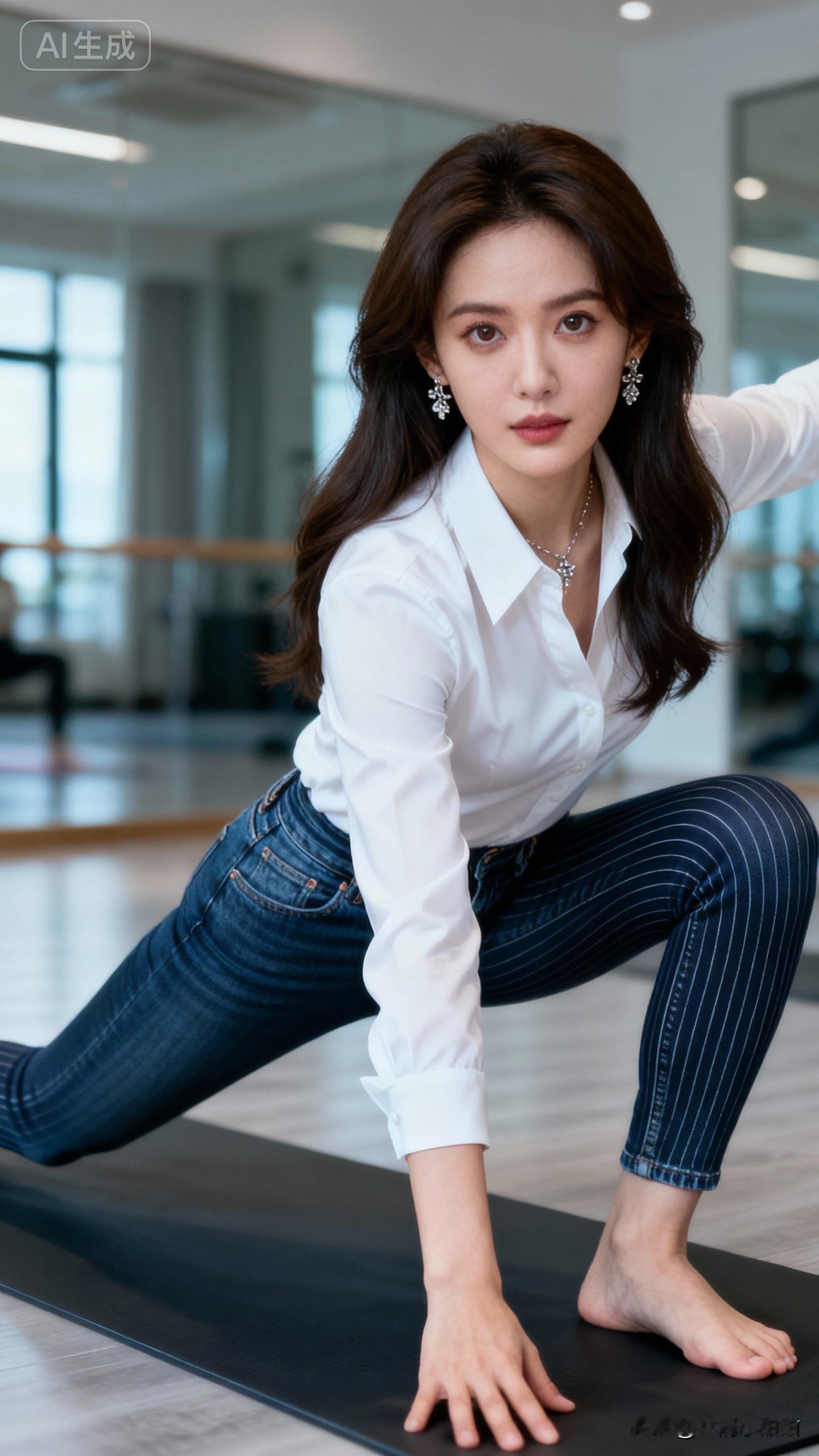 她这身是当下流行的“轻熟风运动混搭”穿搭:白色缎面衬衫搭竖条纹高腰牛仔,适配室内运动场景,是现在很火的“优雅与随性碰撞”思路,既保留了通勤装的精致感,又自带松弛的元气气场。