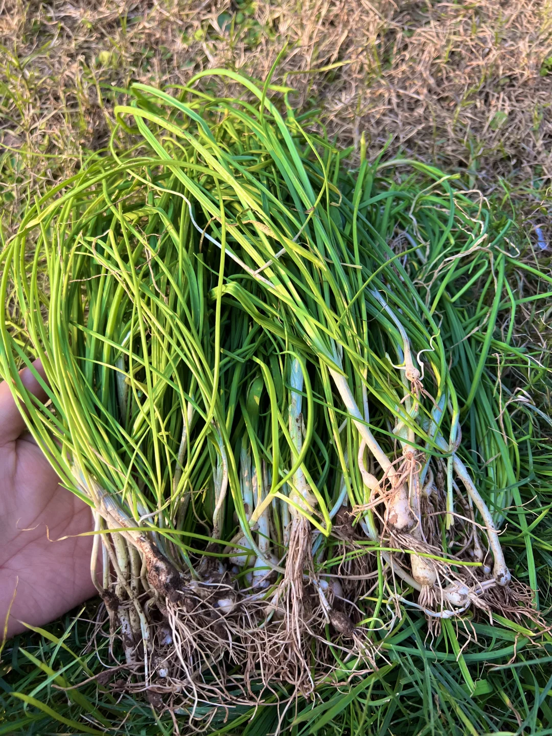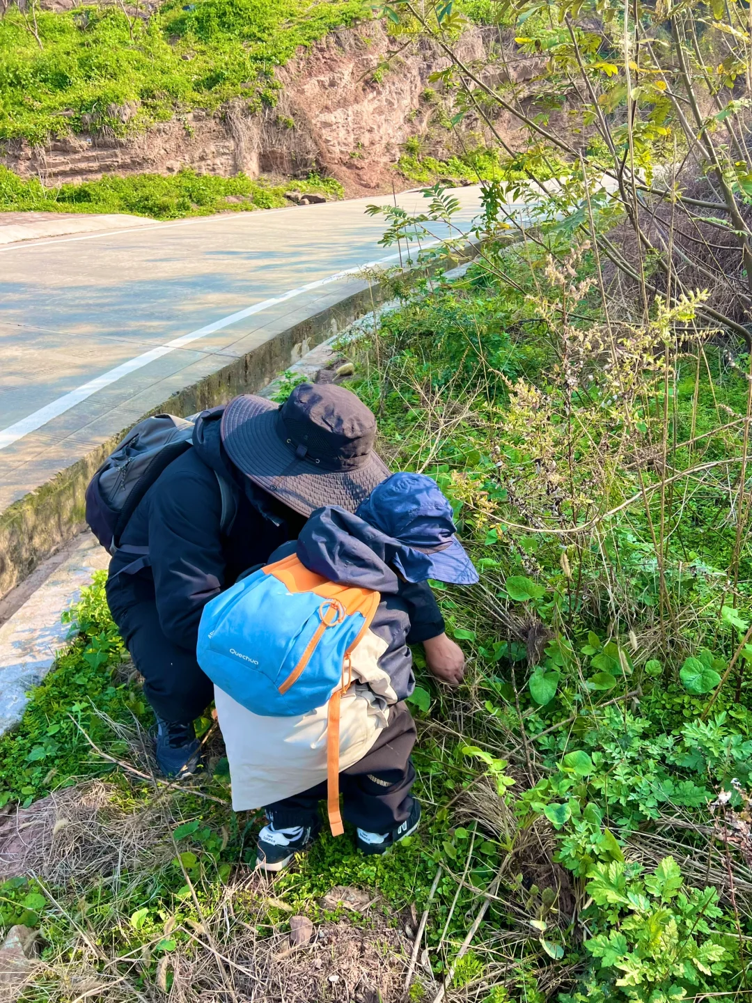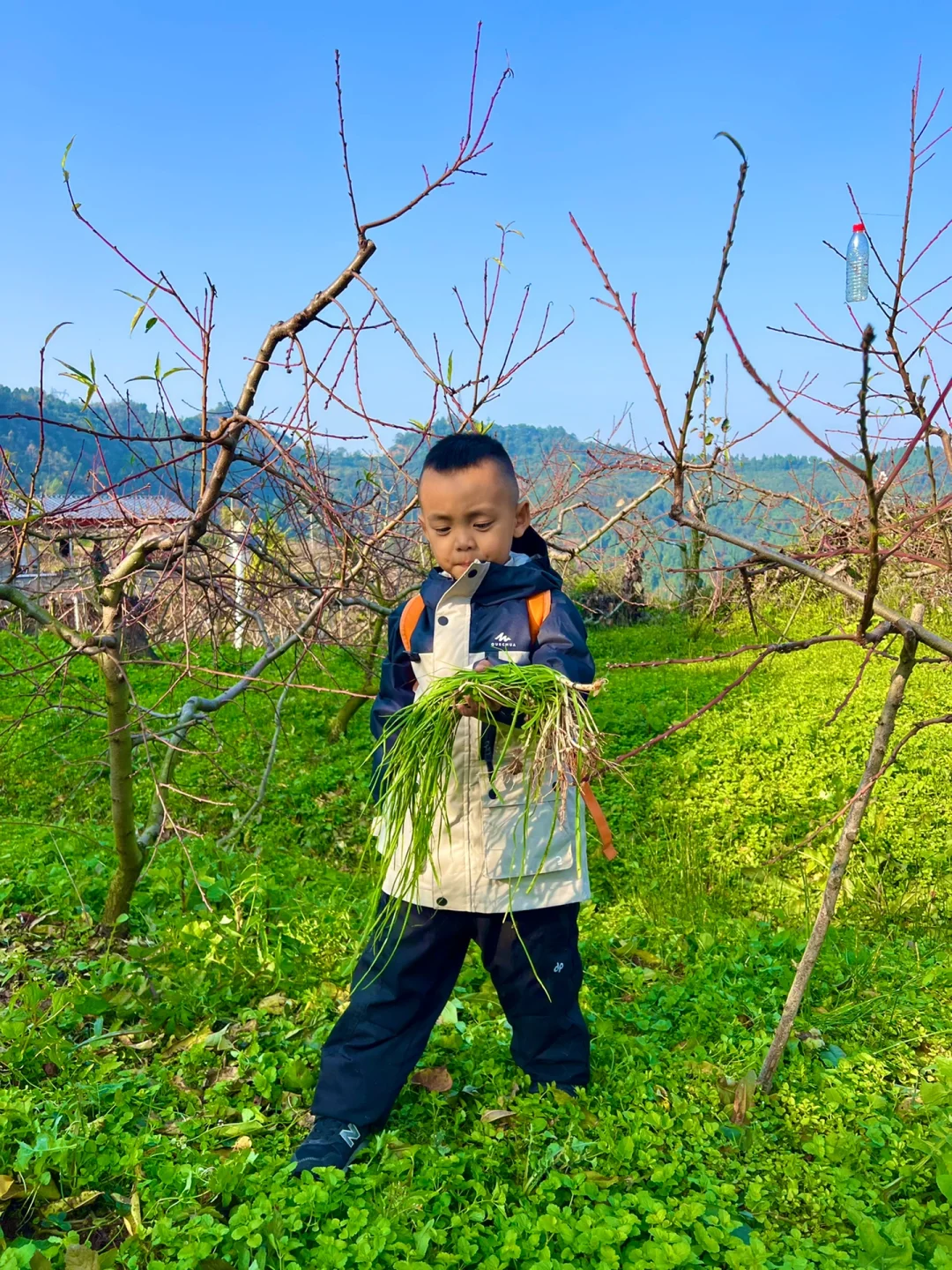 4️⃣挖野葱指南,可以沿着公路多看看,桃林里面绿油油的一般都有很多野葱,可以多找一下,我们在山上发现了很多!
