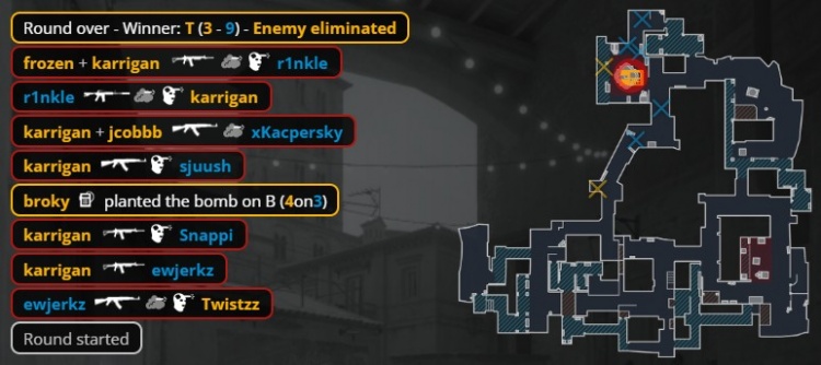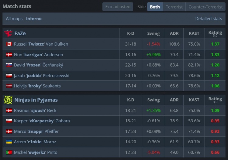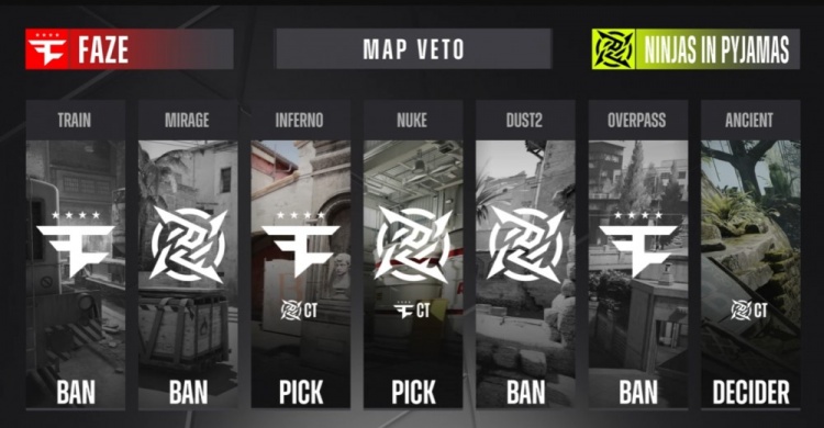 易边再战,FaZe拿下手枪局后被NIP强起翻盘,第15回合FaZe手枪翻盘还以颜色,来到长枪回合,总监三杀将比分追至8-9。NIP枪械不全但xKacpersky铁板双杀后下楼打掉jcobb拿到三杀,次回合xKacpersky次回合再次铁板双杀为NIP连拿2分。总监与jcobb开始发力打爆内A点,FaZe连追两分。第22回合NIP强起先杀FaZe三人,broky残局2v3双门三杀强行为FaZe扳平比分。