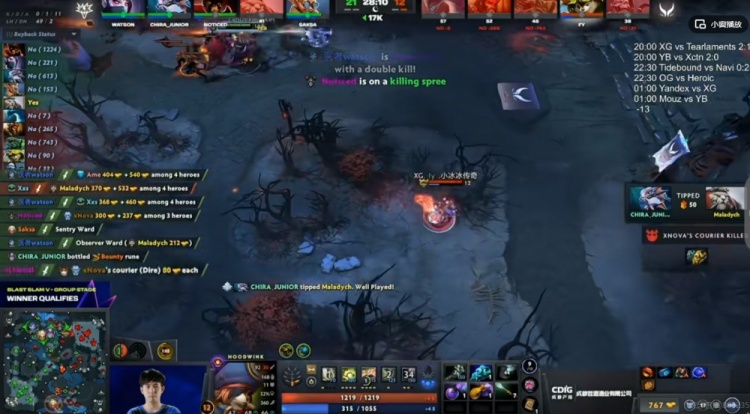 [20分钟]Yandex抱团拆掉XG中二塔,随后野区交战,CHIRA_JUNIOR大鱼人和Noticed末日倒下,但是末日大招还是doom到了Ame水人,watson的TA进场收割,这波Yandex打出2换3,拉开12K的经济差了!