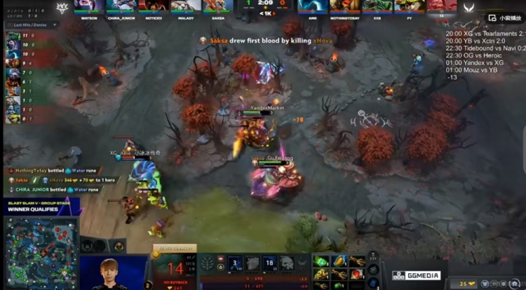 [9分钟]Ame水人在中路被Noticed末日抓到,一个大招完成击杀!回头XG河道多打少终于击杀掉了Maladych海民!开胡了!不过随后下路XG强杀海民失败,Saksa老奶奶轰炮配合队友反打,再一次留住NTS兽王!双方经济差4K了!