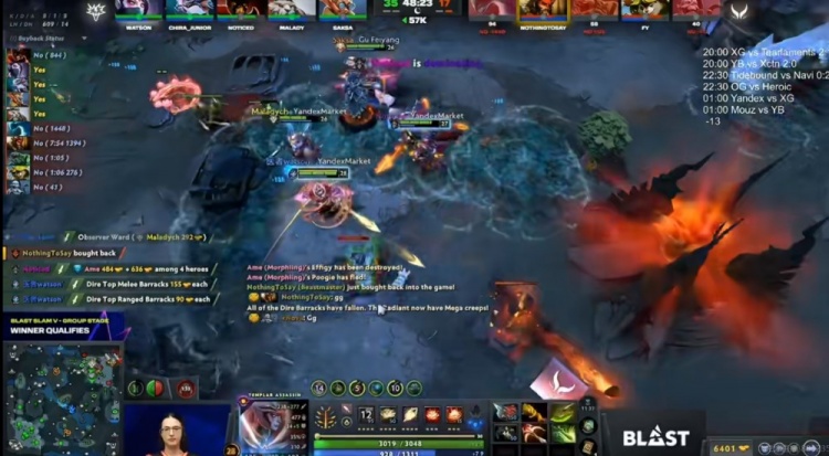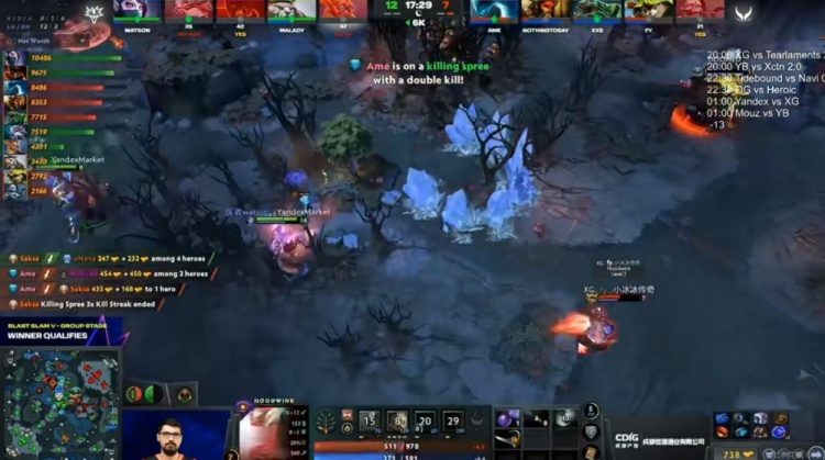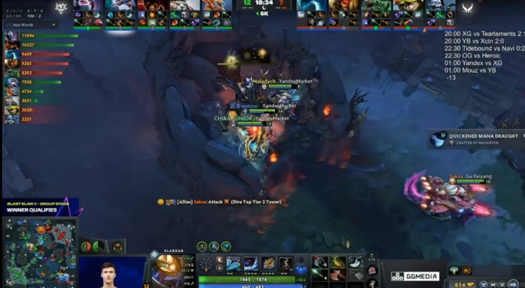 天辉Yandex:CHIRA_JUNIOR大鱼人、Saksa电炎绝手、Maladych巨牙海民、Noticed末日使者、watson圣堂刺客