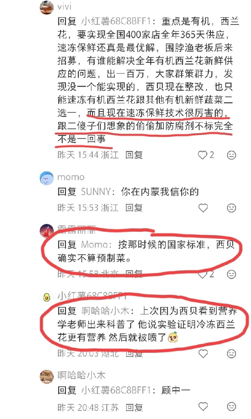 西贝的生意慢慢好起来了,网上的风评也慢慢好起来了?网络舆情,真的只有七天的记忆吗? 从这位北京网友发出的图片可以看到,西贝门店周末已经开始叫号排队了。而评论区的网友很多又在就“冷冻蔬菜和新鲜蔬菜哪个更有营养”这个话题争论不休了,而且隐隐有“冷冻蔬菜更有营养”这个观点占上风的趋势!很多人也再次抛出“西贝里面的菜本身就不是预制菜”的观点! 评论区的诸位大神,就西贝这个现象,你们是什么看法?