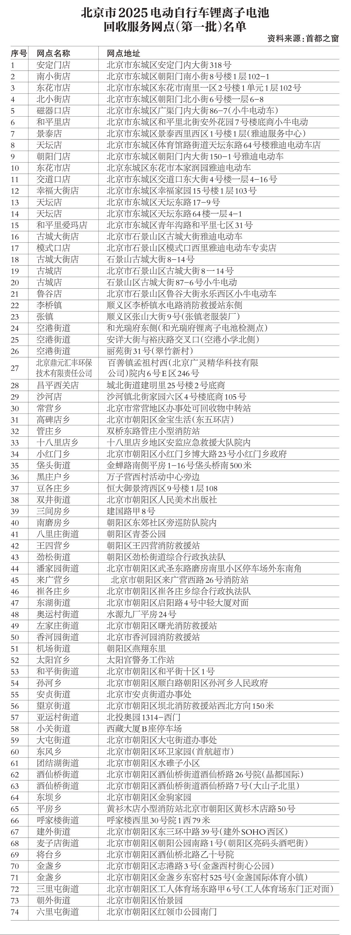 电动自行车在北京的保有量与日俱增,从2008年的80多万辆增长到2025年的700余万辆,这也使得电池回收成为一大难点。就在今年11月27日,北京市经信局公布了《北京市2025电动自行车锂离子电池回收服务网点(第一批)名单》,提出要进一步增强北京全市电动自行车全链条管理,构建安全、便利、可靠的废锂电池回收体系,推动锂离子电池规范回收,首批设了74个回收网点。