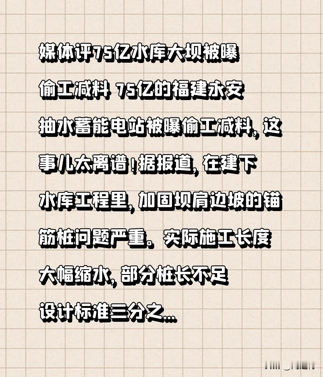 媒体评75亿水库大坝被曝偷工减料 媒体评75亿水库大坝被曝偷工减料 媒体评75亿水库大坝被曝偷工减料 75亿福建永安抽水蓄能电站 被曝偷工减料 此事离谱至极 据报道 在建下水库工程里 加固坝肩边坡锚筋桩问题严重 实际施工长度大幅缩水 部分桩长不足设计标准三分之一 多数未按规范灌注水泥砂浆 仅简单封浆应付检查 知情人士称 右岸边坡锚筋桩设计从9米调为12米 实际却仅有3至5米 工人透露 或许仅30%锚筋桩达标 11月29日深夜 中国电建已成立调查组 但如此重要项目出此问题 着实令人忧心后续调查处理结果 福建水电站 水库塌陷 福建大坝调查 宁德水下堵漏 电站排洪水