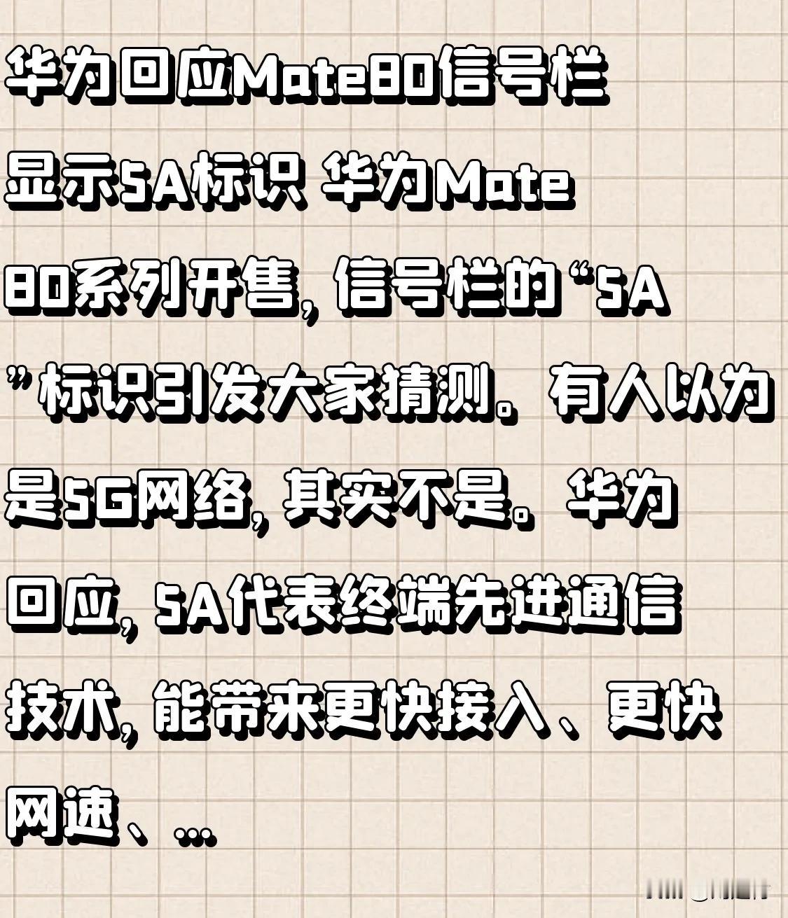 华为回应Mate80信号栏显示5A标识 华为回应Mate80信号栏显示5A标识 华为Mate 80系列开售 信号栏“5A”标识引猜测 有人以为是5G网络 实则不然 华为回应 5A代表终端先进通信技术 能带来更快接入 更快网速 更低时延 更稳连接的综合体验 是5A级优质网络体验 这“5A”不等同于5G - A或5.5G 不涉及额外资费 无单独开关 系统默认支持 目前 Mate 80系列、Mate X7系列率先支持 部分华为手机升级HarmonyOS 6.0.0.115 SP6版本后 信号栏也会显示“5A” 华为此举 让大家告别“无G”时代 体验更优质网络 mate80 华为80pro 华为80长焦