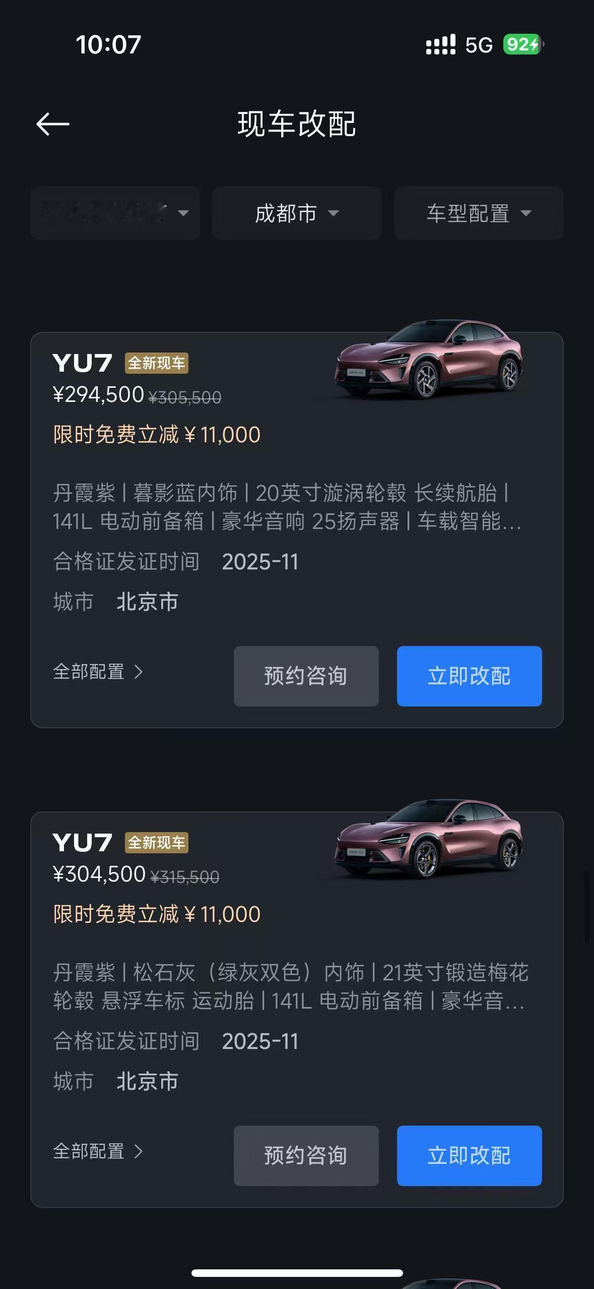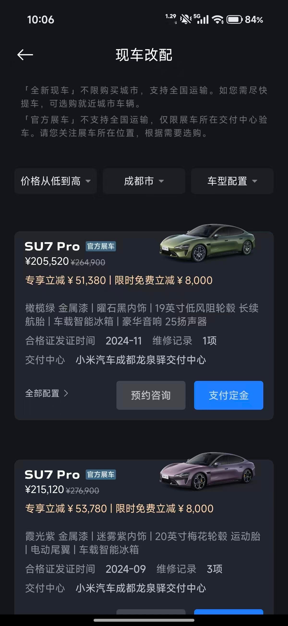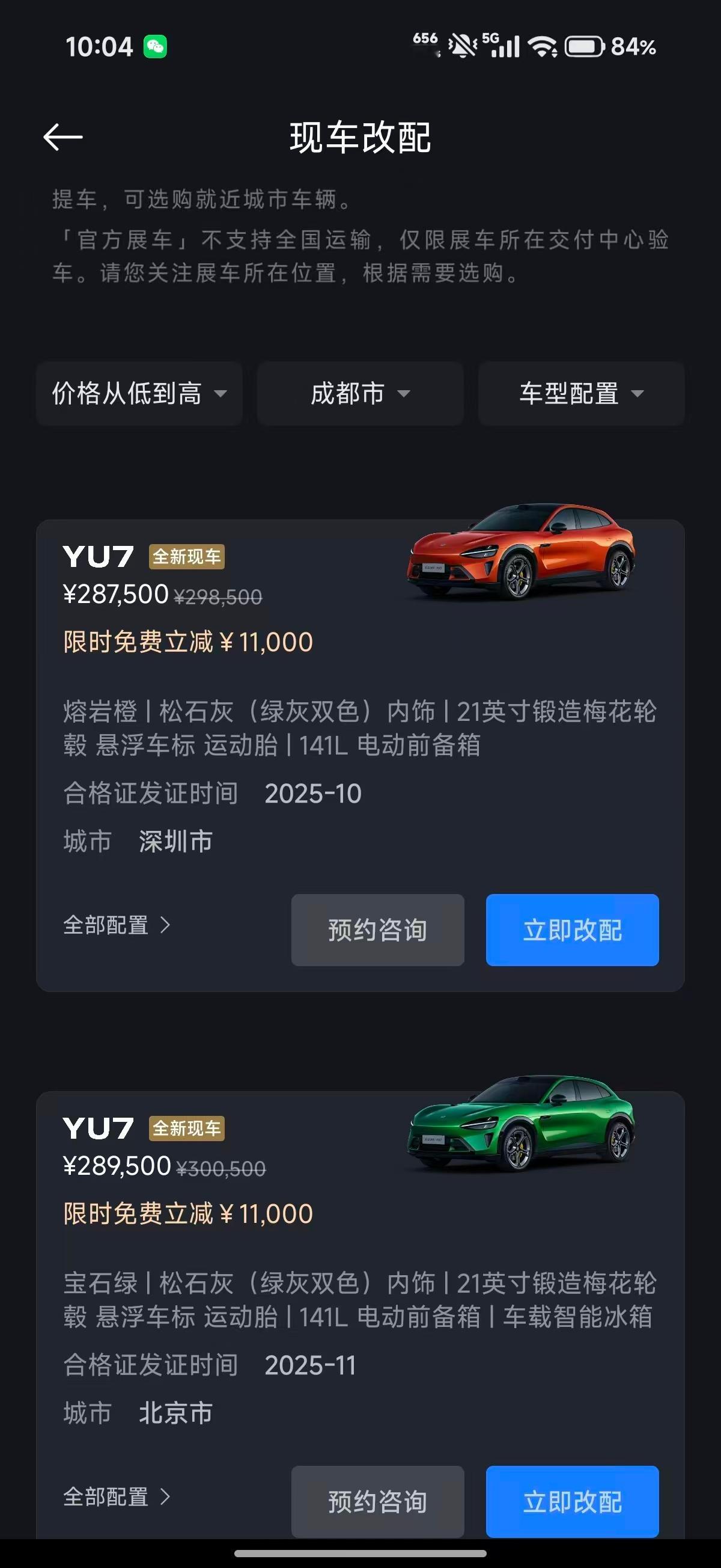我勒个去???没交付的可以看下现车选购,可以早提车不说,我看了下价格有优势分为官方展车和全新现车,按需选择,早点确认早提车