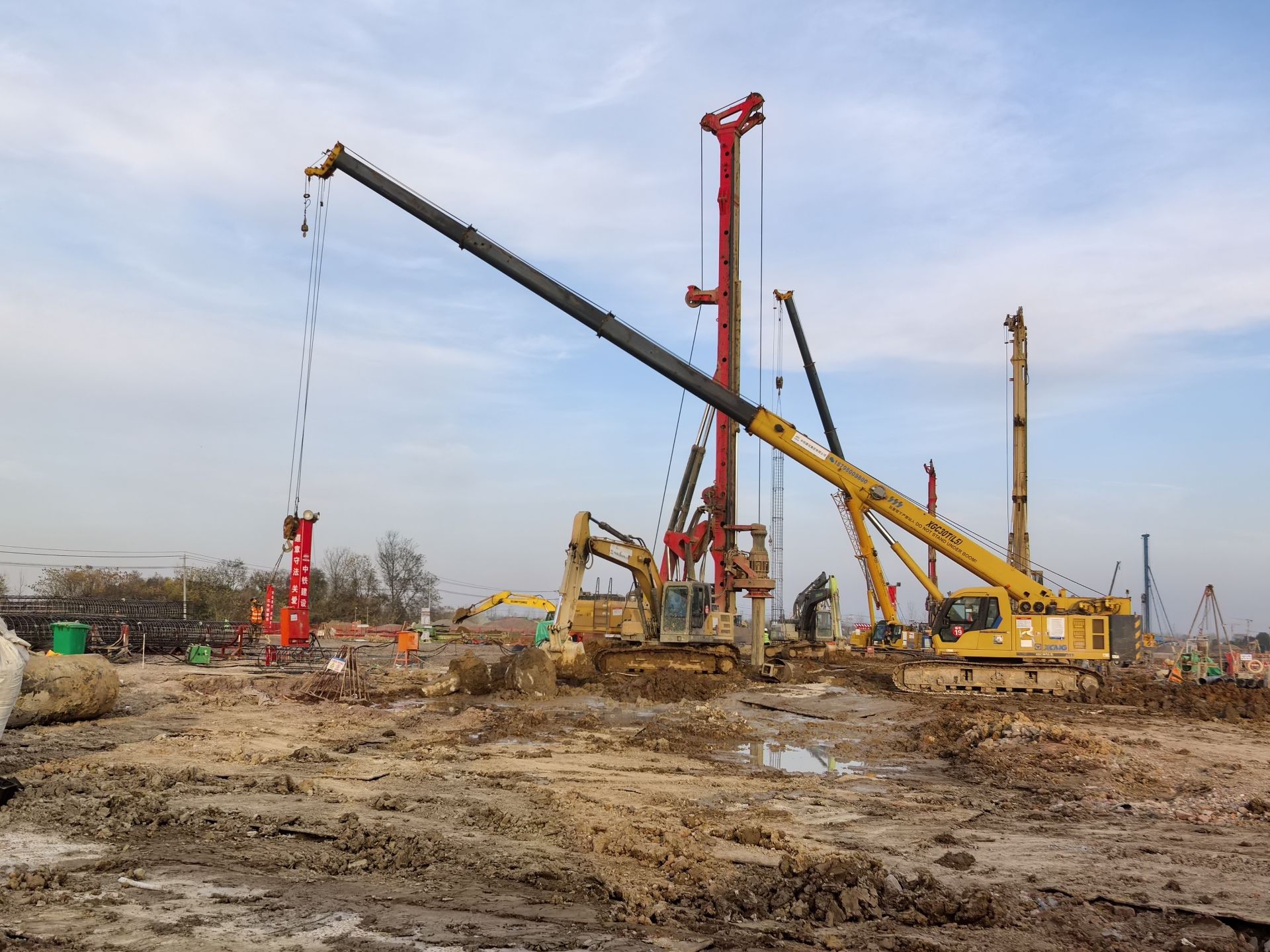 继续东行至核心施工区,方圆数百米内4台大型打桩机轰鸣作业,旁侧4台吊车不停吊运钢筋笼,多台挖掘机同步施工——整个区域机器轰鸣、车辆穿梭,一派繁忙。“这里是未来的站房位置,对面大片区域是站前广场。”施工人员指向线路南侧打桩区域说。