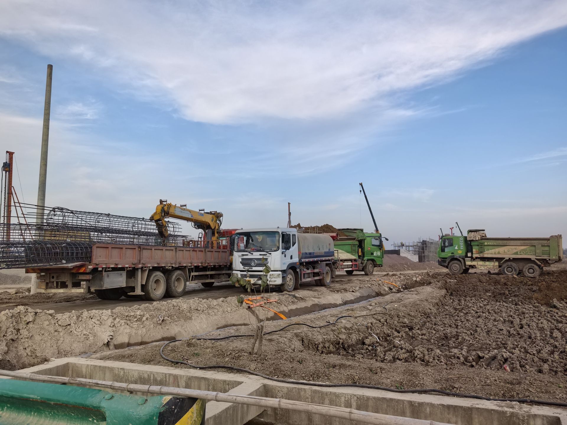 沿线可见多个涵洞已基本建成,线路路基已垫高一两米。渣土与建材运输车辆在各施工区段穿梭,洒水车不时作业降尘。