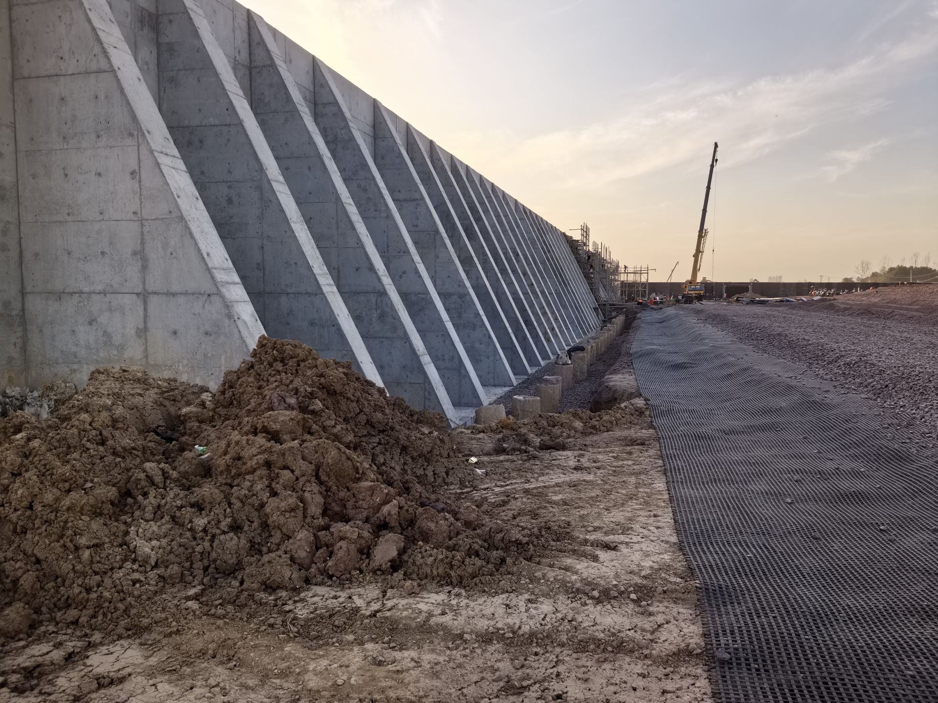 从中心村往东约三四百米,是扶壁式挡土墙建设现场。该挡土墙高约数米、长百米,已完成大半工程量,剩余部分正处于支模阶段。施工工人介绍:“这是挡土用的,一直延伸到西边的涵洞。”