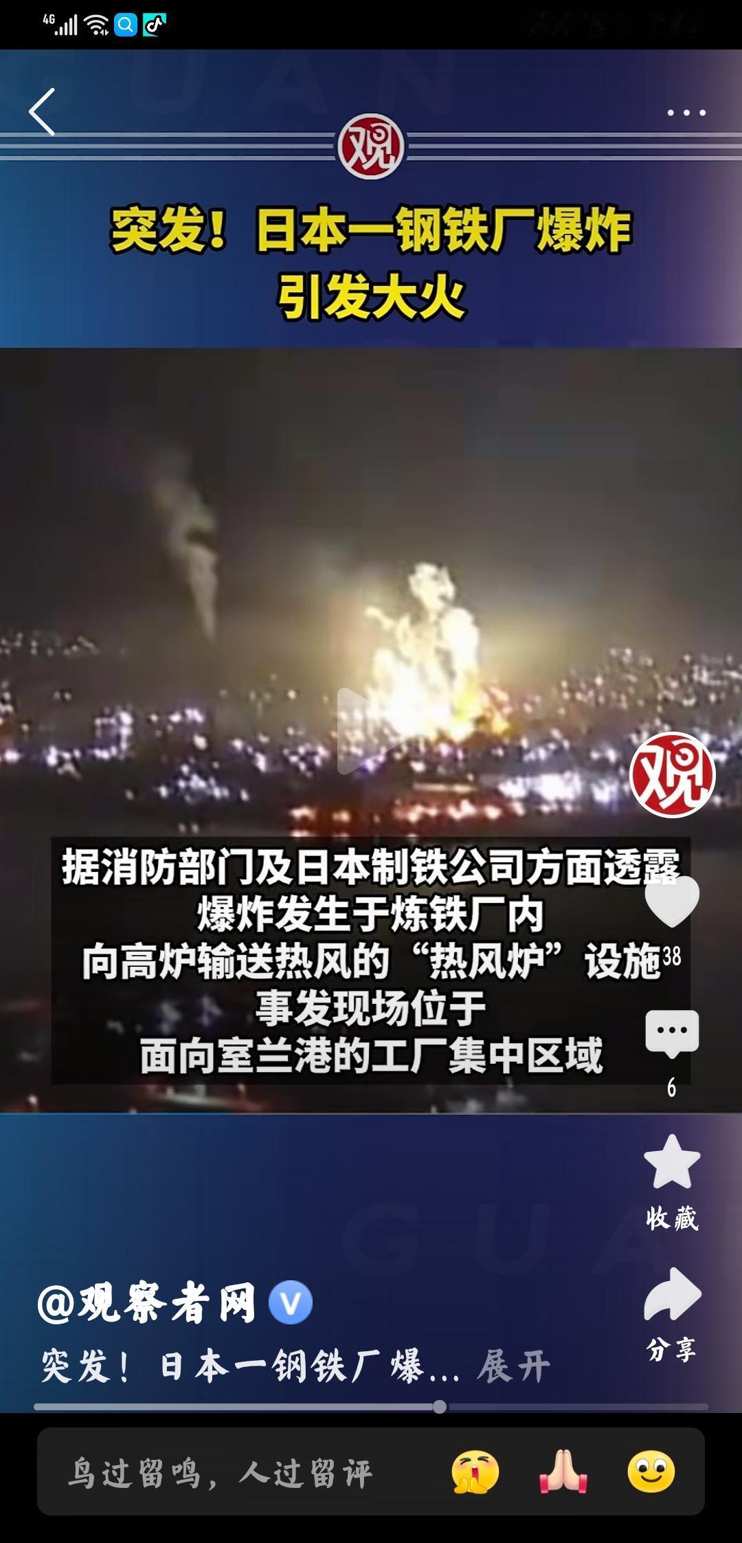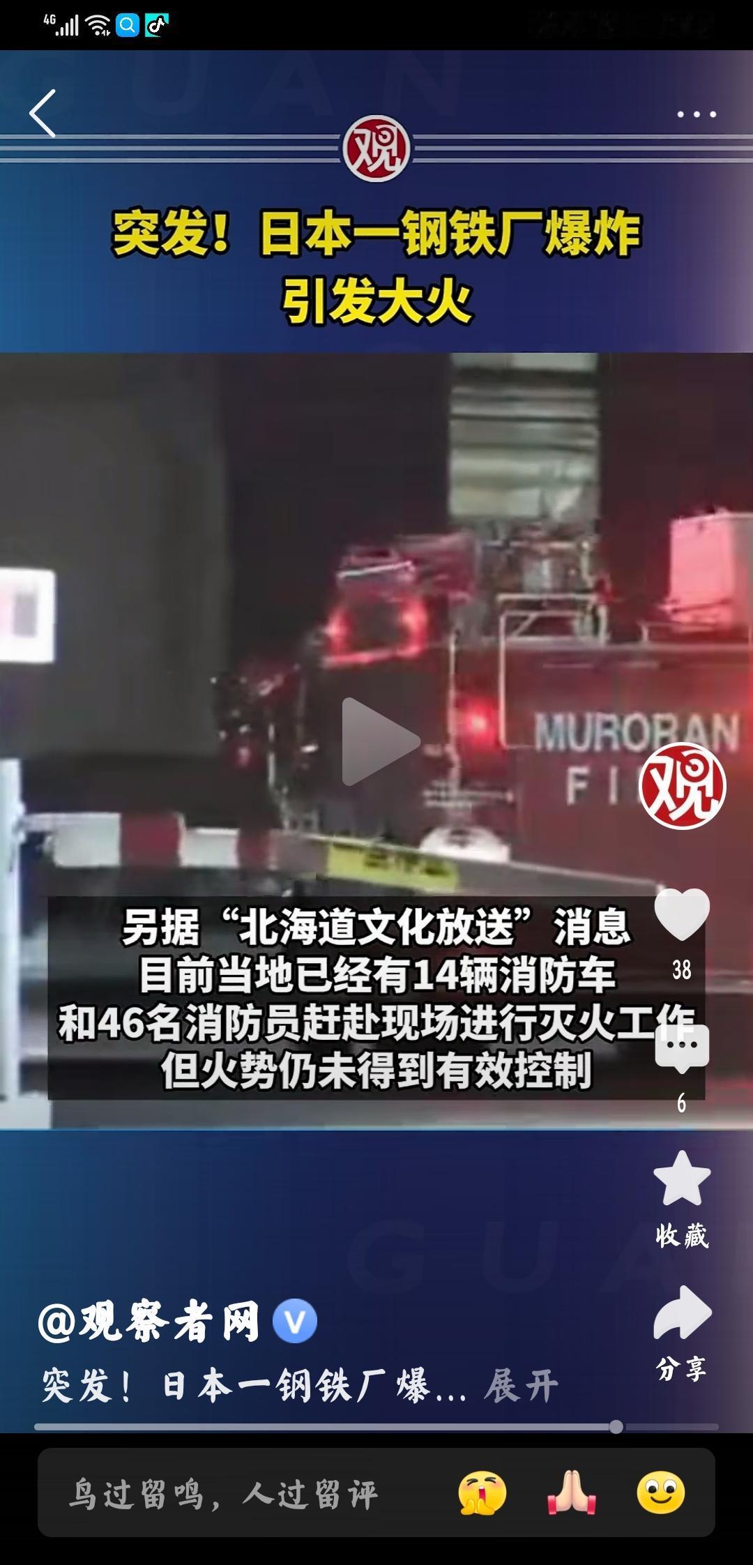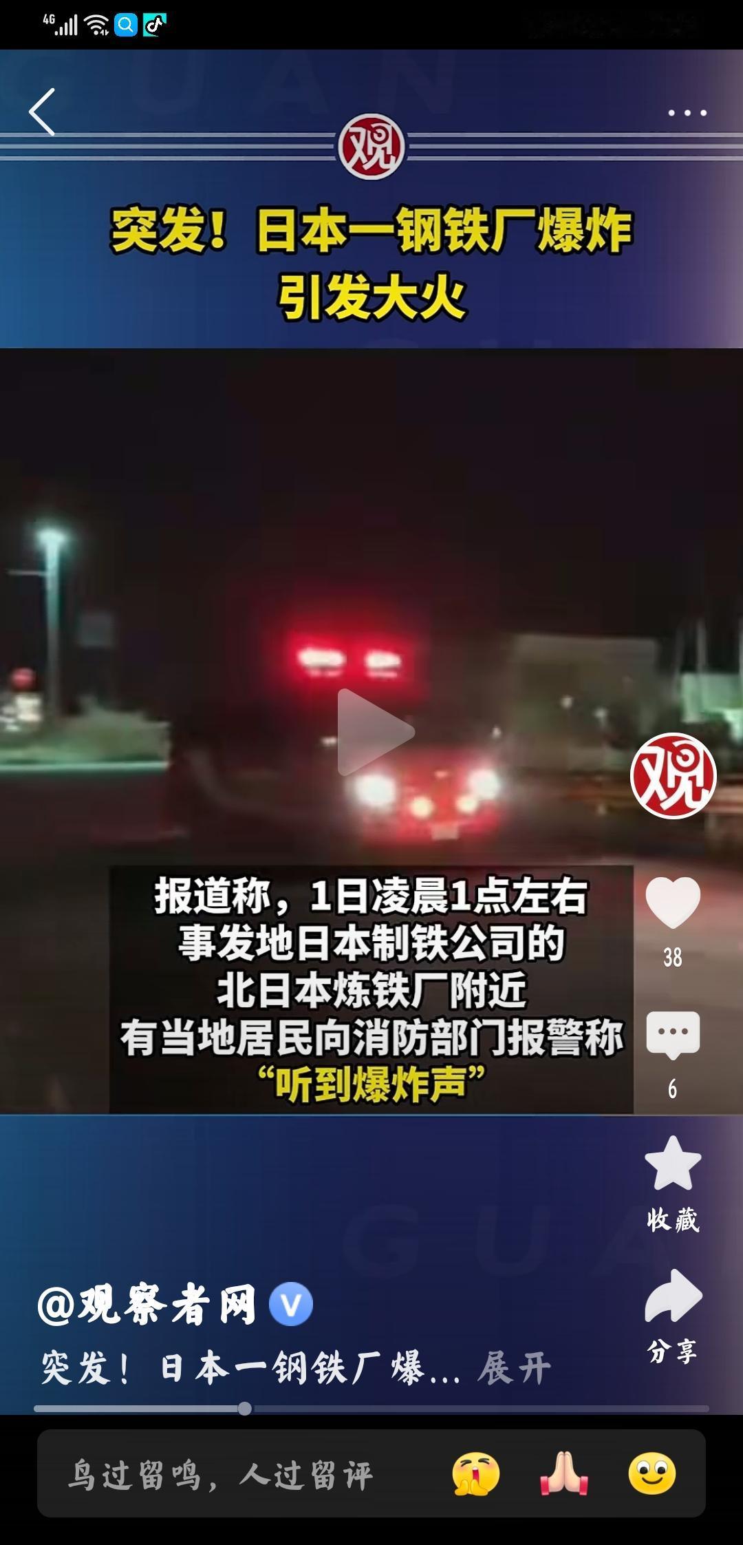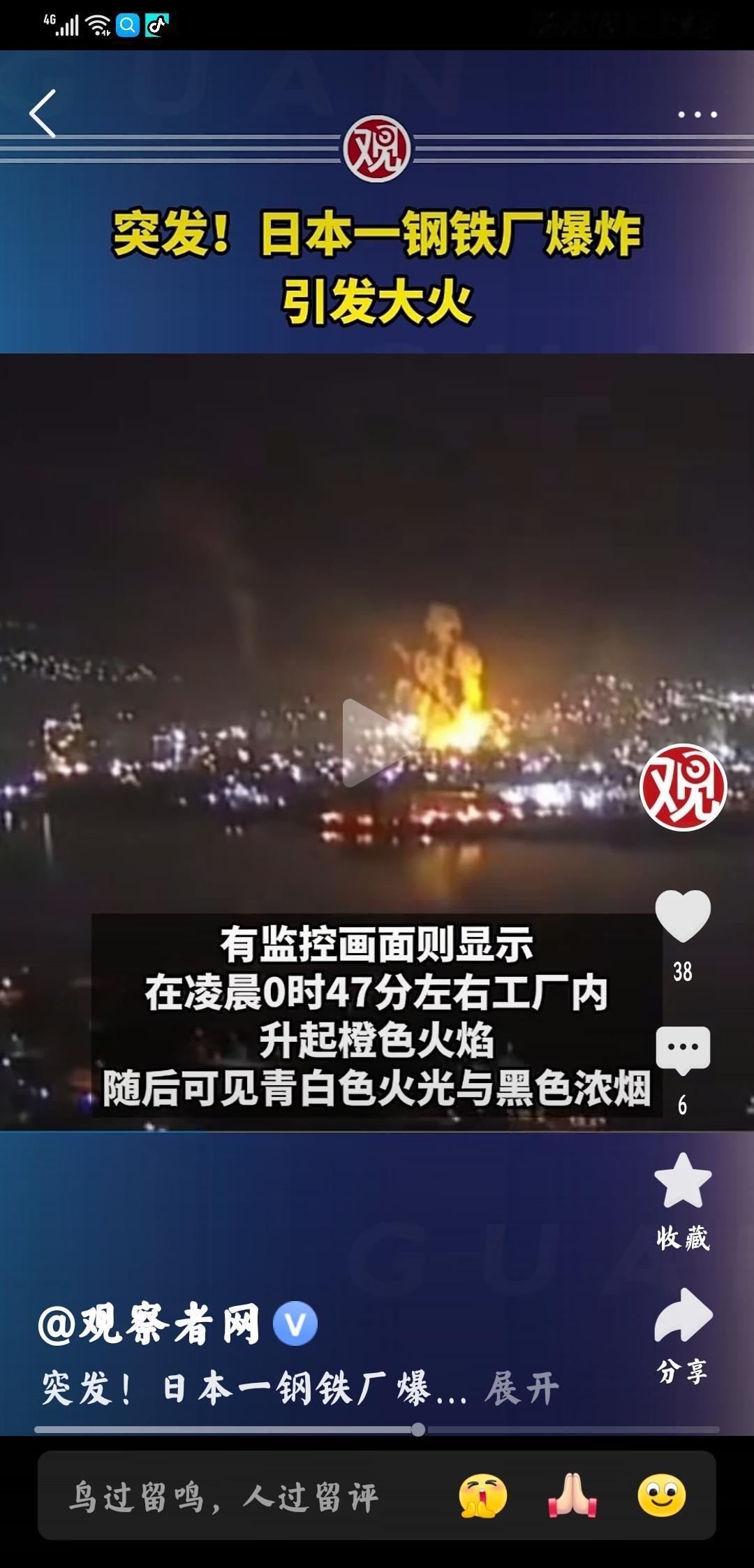 日本钢厂爆炸,当前领导人没有应对吗? 个人观点:日本发生如此大事,钢厂爆炸了,难道日本政府当前领导人没有应对措施吗?日本的民众也没有在网络上留言应对吗?那可是你们的同胞啊。 日本,这是怎么了?老天爷都看不过去了吗?地震,海啸,大火,现在是爆炸。 真是天灾人X。难道老天爷也在反制日本吗?