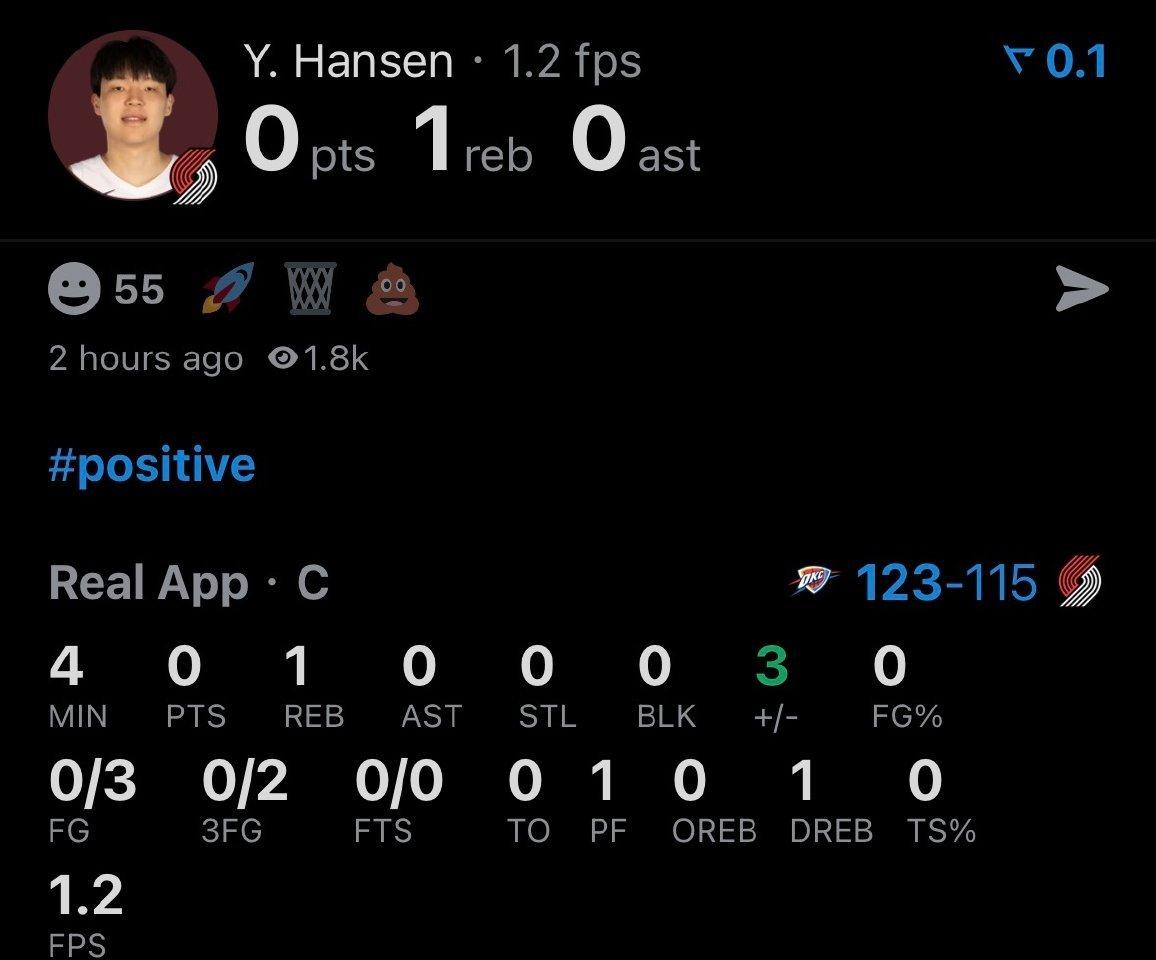 又没抓住机会!杨瀚森今天在对阵雷霆的比赛,仅在次节开场获得上场机会,但状态堪忧,低位单挑切特勾手过桥,底角三分打铁,弧顶三分更是三不沾,防守端还被切特投进三分。 全场比赛,杨瀚森登场4分29秒,3投0中,三分2中0,仅得1篮板,出现1犯规,正负值+3。 感觉杨瀚森现在有点迷失自我了,不知道是被教练斯普利特的用人整自闭了,还是自身实力显露原形了。 进攻拉垮,防守始终掉线,选秀唯一的卖点是策应和三分,现在得分都挂0了,别说混助攻了,再这样下去这赛季真要一直坐板凳了!