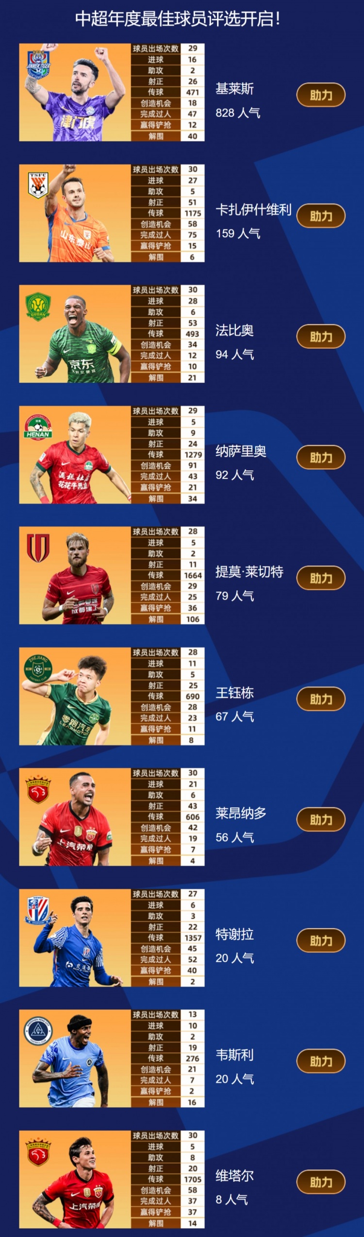 直播吧12月1日讯中超官方公布赛季最佳球员候选名单,共有20名球员入围,瓦科、王钰栋、莱昂纳多、马纳法在列。