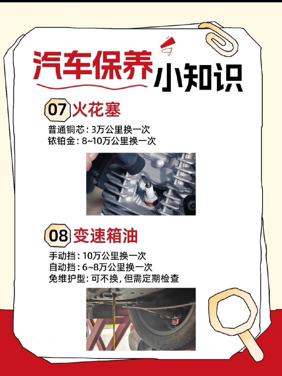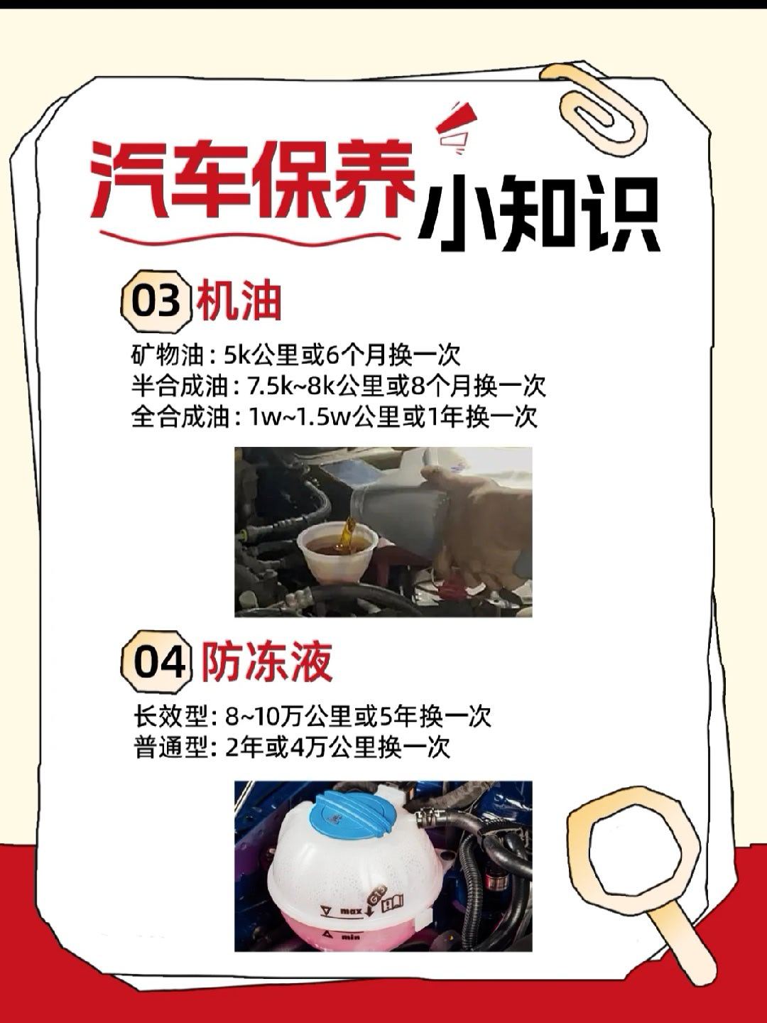 别再说“下次一定”了!这份养车清单再不看,钱包和爱车都要抗议了!🚗💸养车其实超简单,记住这几个关键数字就行!赶紧存图或转发给你家那位“司机”👇✅ 机油多久换?矿物油:5千公里/6个月半合成:7-8千公里/8个月全合成:1-1.5万公里/1年(真心推荐这个!)✅ 刹车安全别马虎!刹车片剩3mm必须换(听金属摩擦声!)刹车油:2年/4万公里必须换!✅ 这几个最容易忘:空调滤芯:1年换一次!(为了呼吸健康)防冻液:普通2年,长效5年火花塞:普通3万公里,铂金8-10万公里✅ 轮胎寿命令牌:5年或6-8万公里,先到为准!⚠️ 重点提醒:别信“免维护”,变速箱油也要定期检查!保养看两个:公里数和时间,哪个先到算哪个!我与汽车的日常大v聊车