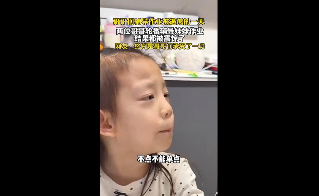 11 月 30 日山西,两位哥哥轮番辅导妹妹作业,从自信满满到被妹妹的 “瞎掰” 震惊到瞳孔地震,引发网友爆笑热议。 哥哥辅导妹妹作业从自信到崩溃的名场面,既好笑又真实! 妹妹的 “反向输出” 把辅导变成欢乐现场,网友调侃 “哥哥扛下所有” 精准戳中笑点。 这背后藏着亲子辅导的普遍困境 —— 辅导者的耐心总会被孩子的 “奇思妙想” 消磨。 但这种兄妹间的互动也格外珍贵,没有父母辅导的紧绷感,多了份打闹式的轻松。 其实辅导作业不必追求 “标准答案”,不如多些包容和引导,让学习在笑声中发生。 这样的欢乐瞬间,既是成长里的小插曲,也会成为家人间的温暖回忆。