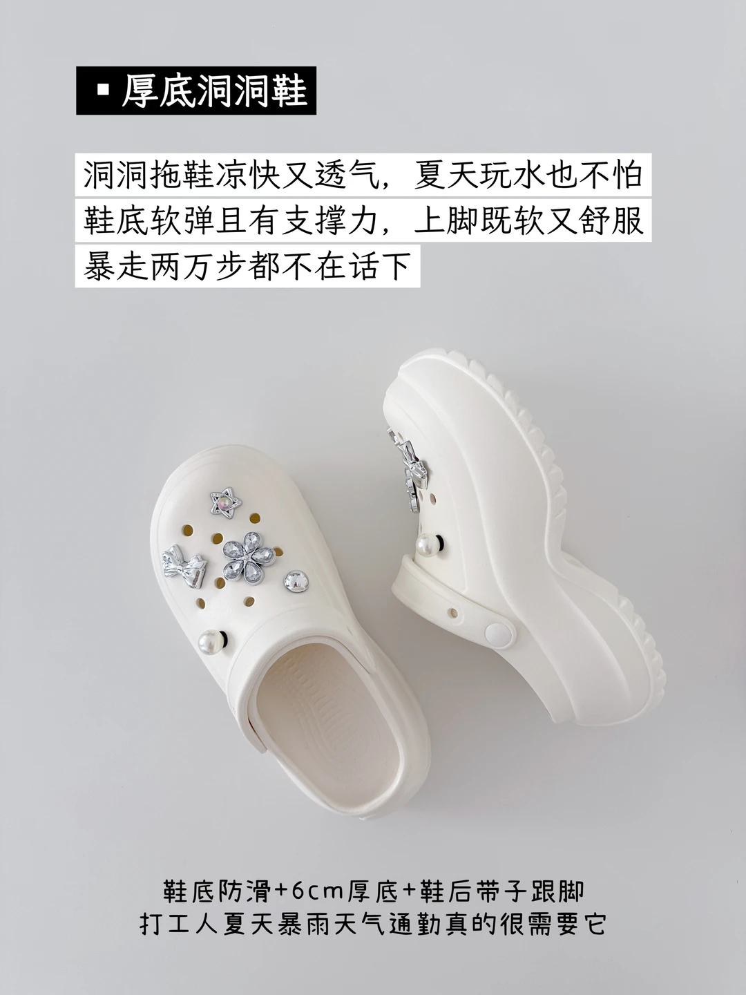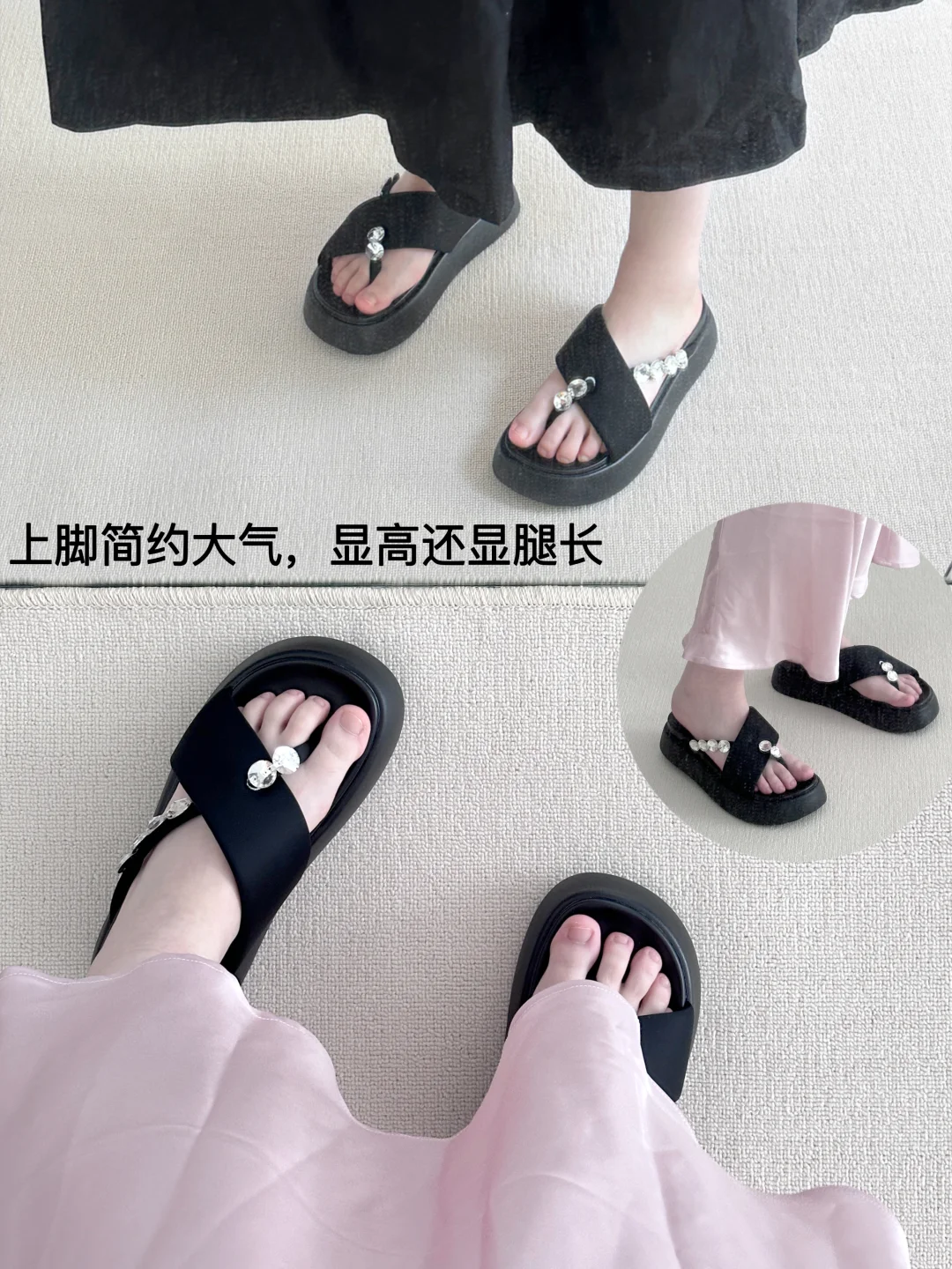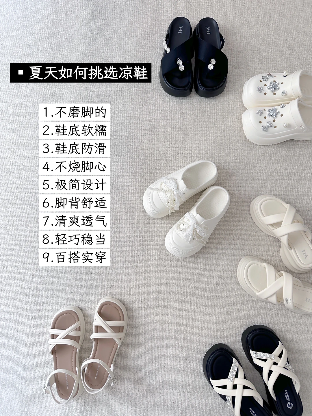入夏啦,上周末整理了我的鞋柜,我夏天的鞋子都是厚底、舒适百搭的款式,而且都不挑脚型和穿搭。 夏天如何挑选凉鞋:: 1.不磨脚 2.鞋底软糯 3.鞋底防滑 4.不烧脚心 5.极简设计 6.脚背舒适 7.清爽透气 8.轻巧稳当 9.百搭实穿 只买长期主义可以重复搭配的好鞋。我的六双严选夏季绝美凉拖: 1.甜美秀气洞洞鞋 2.潮流水钻人字拖 3.仙女风极简凉鞋 4.百搭白厚底拖鞋 5.简约一脚蹬凉拖 6.优化比例洞洞鞋 我是小哈娜,分享简单生活和精致好物。 谢谢你的时间,下次见~