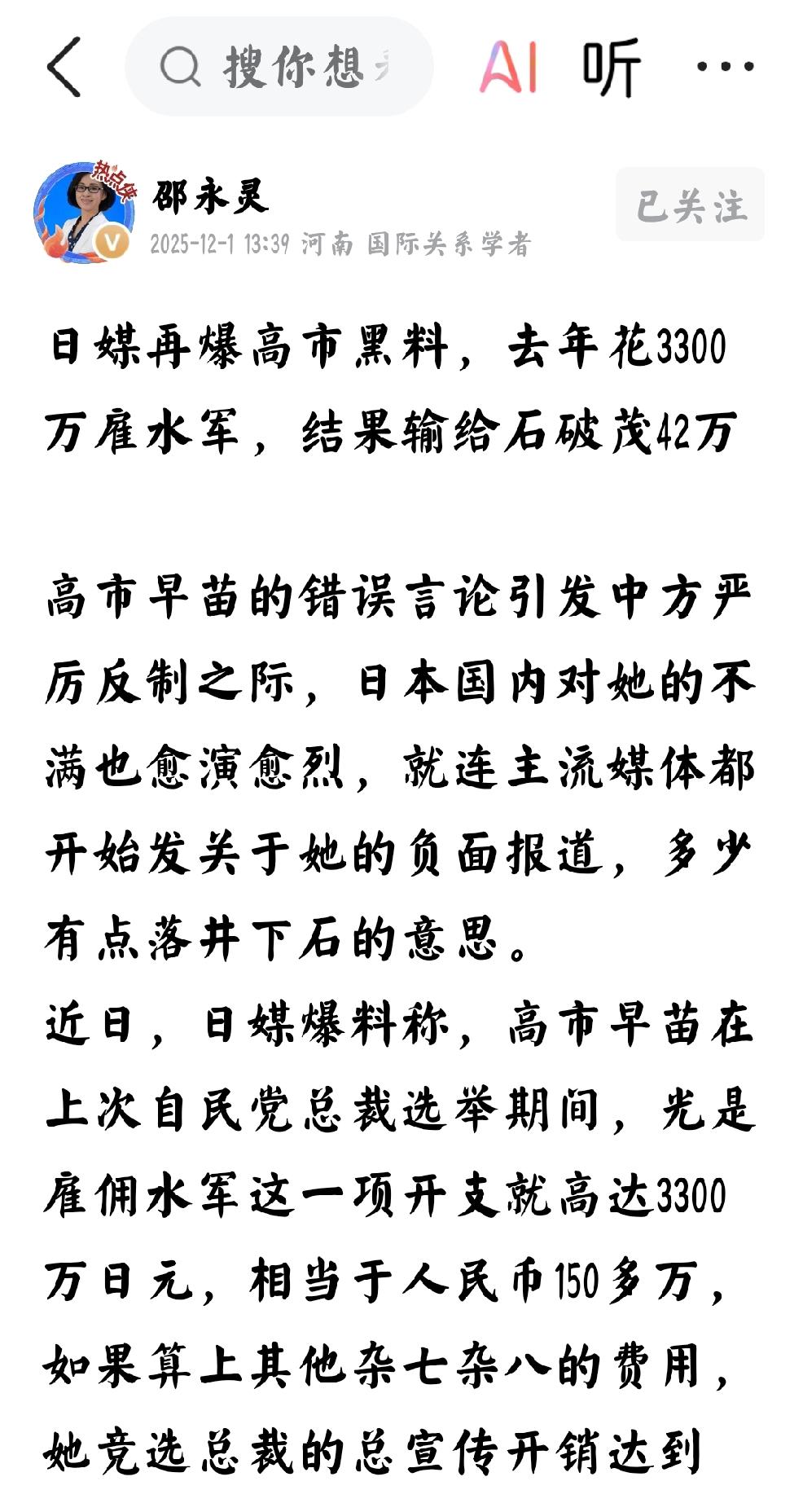 围观:今天日本新闻 25年12月1日 个人观点:今天是25年12月1日,日本的数据显示,日本的物价上涨迅猛;北海道的钢厂,大火还在燃烧,没有扑灭;高市早苗,雇佣水军,千万日元打水漂:日本近海发生地震,是否引起海啸?不得而知。 这个岛国,真的是不适合人类生存。 雇佣水军,千万日元打水漂,这样的假货,居然当上日本当前领导人,果然是小日本特色。 物价上涨,民不聊生,当前首脑,转移矛盾,叫嚣战争。 中国有句俗话,天作孽犹可活,人作孽不可活。 反制日本,方法多种多样,反制效果,高压高温。