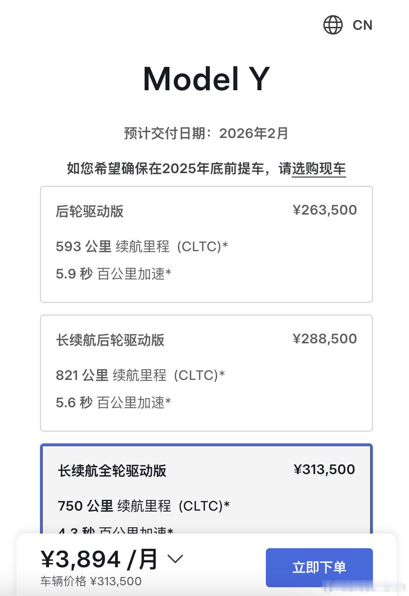 特斯拉官网更新:ModelY后轮驱动版,2026年1月交付,长续航版2026年2