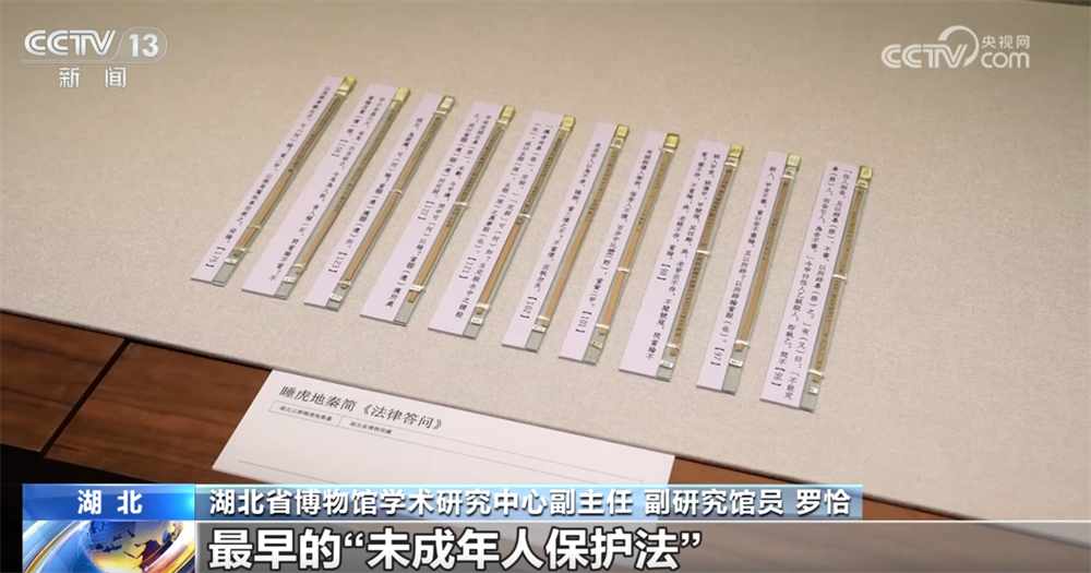罗恰称:“这一组简就是睡虎地秦简里面的《法律答问》,这里面就有目前我们发现的最早的‘未成年人保护法’。当时未成年人不是以年龄来界定,是以身高6尺来界定,大概相当于现在的不到139厘米的样子,6尺以下是未成年人。这里面讲的是有一个不到6尺的小孩去放马,马受到了惊扰,吃掉了人家一石的庄稼。那么现在就问这个小孩该不该受到惩处,回答是不该受到惩处,而且也不用去赔偿庄稼,也是当时对未成年人进行一个特殊照顾的体现。”