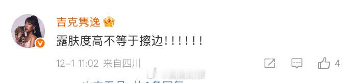 吉克隽逸 露肤度高不等于擦边 谁懂吉克隽逸的霸气 !面对穿搭布料少的 “擦边” 质疑,她 5G 冲浪光速回应,直接正面表态 “露肤度高不等于擦边”,态度鲜明坚定,好感度拉满!