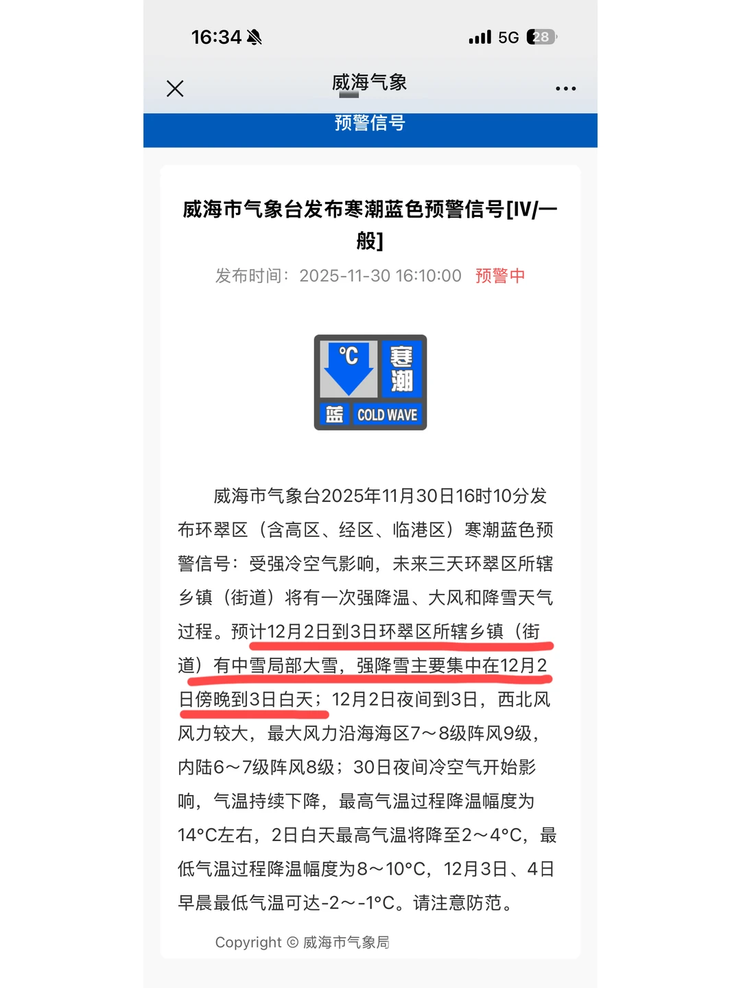 姐妹们,经威海气象局通知,12月2日、3日威海会有2天的雨雪天气!!蹲下雪的姐妹们可以冲啦!!