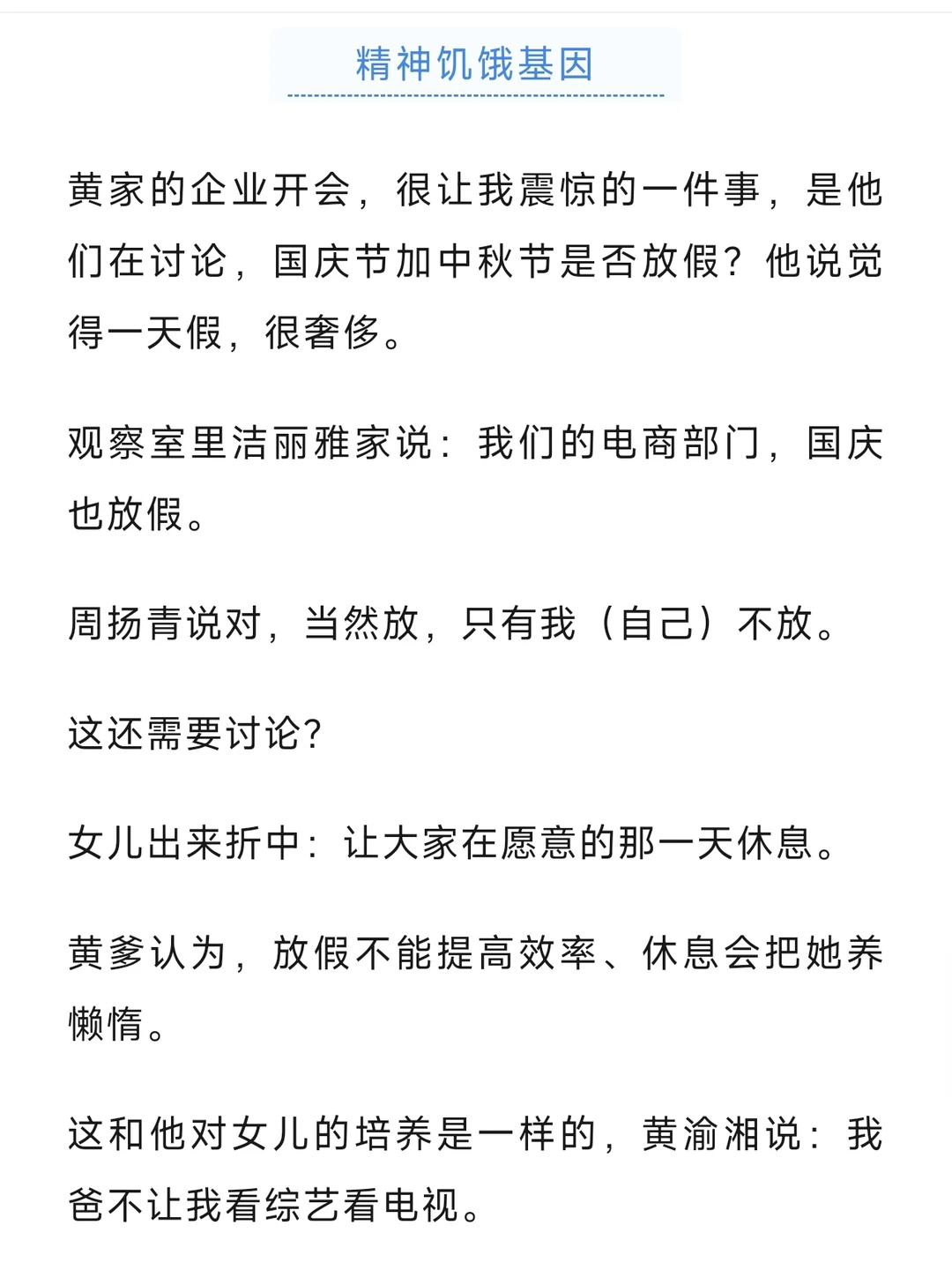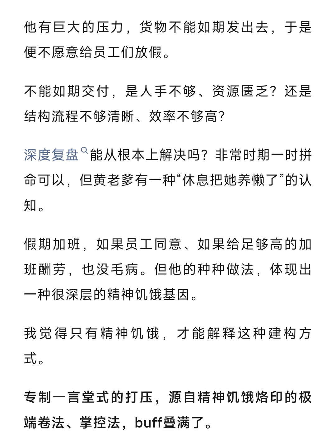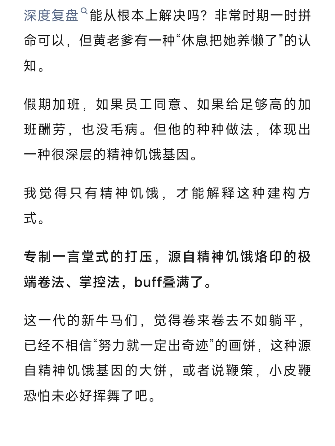 假期加班,如果员工同意、如果给足够高的加班酬劳,也没毛病。但他的种种做法,体现出一种很深层的精神饥饿基因