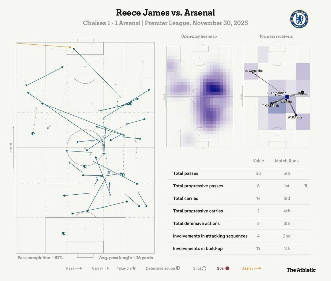 TA:蓝军少一人作战也能游刃有余,詹姆斯展现了队长的担当切尔西阿森纳 英超第13轮的一场焦点之战中,阿森纳客场1-1战平切尔西,赛后,The Athletic发表了专题文章,分析了本场比赛,以下为专题文章。切尔西与阿森纳在斯坦福桥上演了一场身体对抗激烈的伦敦德比,最终以1-1收场,比赛中黄牌频现,一张红牌外加多次强硬铲抢。开场仅13分钟就出现三张黄牌,比赛以疯狂节奏展开。随后莫伊塞斯-凯塞多因对梅里诺的迟放铲被VAR介入改判红牌罚下。顶替受伤的萨利巴首发与克里斯蒂安-莫斯克拉搭档阿森纳中卫因卡皮耶,不久后手臂击打特雷沃-查洛巴也吃到黄牌。下半场刚开始,查洛巴利用角球头槌破门,使十人应战的切尔西意外取得领先。随后梅里诺在布卡约-萨卡的精妙传中后头球扳平比分。13轮战罢,阿森纳仍居英超榜首,领先切尔西6分,领先曼城5分。这对冠军争夺意味着什么?这场平局意味着阿森纳依然在积分榜上保持着5分的领先优势。在赛季早期阶段,这仍是相当可观的领先幅度。关键在于,阿森纳避免了失利,否则分差将被大幅缩小。枪手或许会感到失望,未能充分利用人数优势。在斯坦福桥击败同城对手本可对潜在争冠对手造成巨大心理打击。但即便是11打10,阿森纳也未能持续施压或创造出一连串机会。切尔西在比赛结束时的射门次数反而明显更多。阿尔特塔的球队整体状态未达最佳,因此拿到一分或许可被视为一个合理的结果。切尔西也能从给阿森纳制造的严峻考验中获得鼓舞。在马雷斯卡的球队在被罚下一人之前表现更佳,并且在少一人作战时也应对得当。在如此激烈的开场后,凯塞多的红牌是必然吗?这场身体对抗激烈——双方飞铲不断——的比赛让人感觉像是回归了老派英超的风格。上半场主裁判安东尼-泰勒就出示了五张黄牌(切尔西一张,阿森纳四张),外加凯塞多的红牌。比赛基调早早定下,开场13分钟内即出现三张黄牌——马丁-苏维门迪对里斯-詹姆斯战术犯规、马克-库库雷利亚对萨卡粗野铲抢、以及莫斯克拉阻止若昂-佩德罗发动反击。在这场本就火药味十足的比赛中,凯塞多似乎尤其兴奋,他在球场上四处飞奔,用身体宣告存在,比赛早期就曾推倒尤里恩-廷贝尔。然而,他在上半场结束前一时冲动,鞋底亮出蹬踏到了梅里诺的脚踝。这位厄瓜多尔国脚自己当时也痛苦倒地,泰勒最初出示了黄牌,但经VAR复核后升级为红牌,认定其使用了“过度力量”。几分钟后,因卡皮耶在与查洛巴争顶头球时吃到黄牌。而上半场结束时与开局时如出一辙,恩佐-费尔南德斯撞倒莫斯克拉,双方陷入激烈缠斗。由于阿森纳三名防守球员身背黄牌,其中里卡多-卡拉菲奥里(因对詹姆斯犯规染黄)在半场休息时被刘易斯-斯凯利换下。下半场刚开始几秒钟,因卡皮耶就把若昂-佩德罗放倒在地,再次定下对抗基调,随后替补登场的刘易斯-斯凯利也因撞倒詹姆斯吃到黄牌。不过,在经历了硬碰硬的上半场,尤其是阿森纳扳平比分之后,下半场的火药味有所减退——尽管瑞典前锋哲凯赖什仍有时间对罗伯特-桑切斯完成一记重炮抽射(补射梅里诺的射门)。马雷斯卡如何应对再次少一人作战?切尔西主帅在本赛季早些时候曾承认,球队必须在10人应战时有所改进。随着凯塞多成为本赛季第六位染红的球员,他得到了大量“练习”机会。马雷斯卡肯定不想这么快就又面临考验,尤其是对阵联赛领头羊。切尔西本赛季三场英超败仗中有两场是在少一人作战时发生的(接连对阵曼联和布莱顿)。在那两场比赛中,马雷斯卡的关键调整之一都是换下埃斯特旺,本场他再次做出了相同决定。马雷斯卡等到半场休息时才进行调整。这位巴西国脚虽未在最佳状态,但在开场45分钟内仍是切尔西最有威胁的进攻点之一。通过换上加纳乔,马雷斯卡暗示他尚未完全信任埃斯特旺在防守端的贡献。任何关于切尔西缺乏雄心的抱怨都在主队重新开赛后不久即取得领先时烟消云散。或许是对切尔西防守定位球能力日益增长的担忧,解释了马雷斯卡决定派上德拉普。若昂-佩德罗作为单箭头效果不佳,但如果马雷斯卡将这位巴西球员后撤到他喜欢的10号位,前面摆上德拉普,本可以保持进攻体系的原有感觉。随着切尔西退守并依靠零星反击来缓解压力,德拉普不可避免地难以获得支援。对于阿森纳的扳平球在防守端的表现,球队可能会有些许失望,但这与之前提到的两场失利中球队崩盘的方式已不可同日而语。阿森纳创造的机会并不算多,而切尔西依然能够向前推进并给客队制造一些麻烦。马雷斯卡肯定会将此视为球员们正在进步的又一个标志,尽管这仍是丢失了两分。詹姆斯如何担当起队长职责?作为与凯塞多搭档的中场之一,里斯-詹姆斯是切尔西今晚最耀眼的球员。他在球场上令人印象深刻的冷静沉着,导致三名阿森纳球员——苏比门迪、卡拉菲奥里和刘易斯-斯凯利——因对他犯规而吃到黄牌。在下半场切尔西少一人作战、中场存在因凯塞多离场而留下的空缺时,这位队长再次挺身而出,奉献了一场出色的表现,在无球时不知疲倦,有球时则展现技术品质。甚至连查洛巴为球队打入的进球,也来自他开出的角球。这是一次真正的队长级表现。莫斯克拉与因卡皮耶的搭档有潜力吗?阿森纳球迷原本就知道加布里埃尔将缺阵,但萨利巴未进入首发阵容则是一个糟糕的意外。“他昨天感觉不适,所以我们