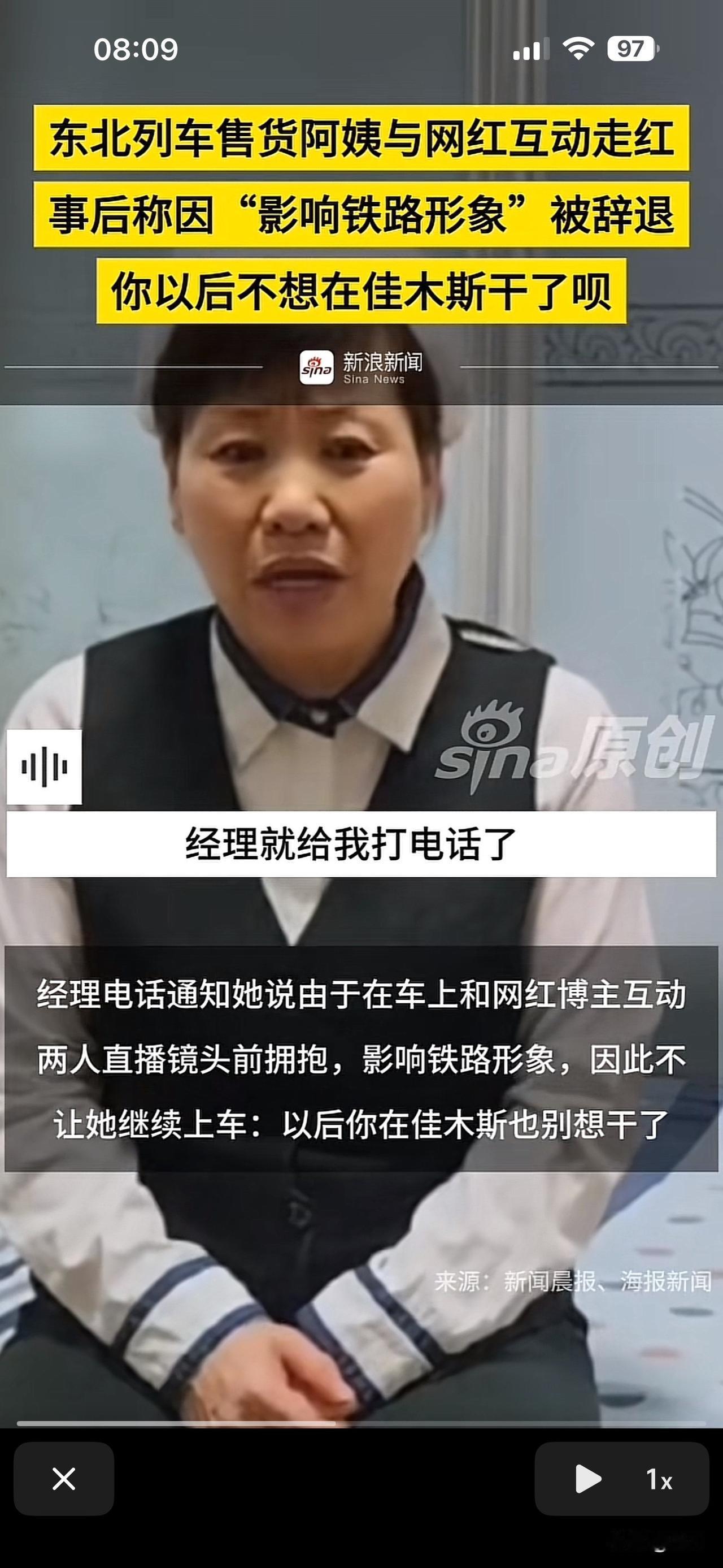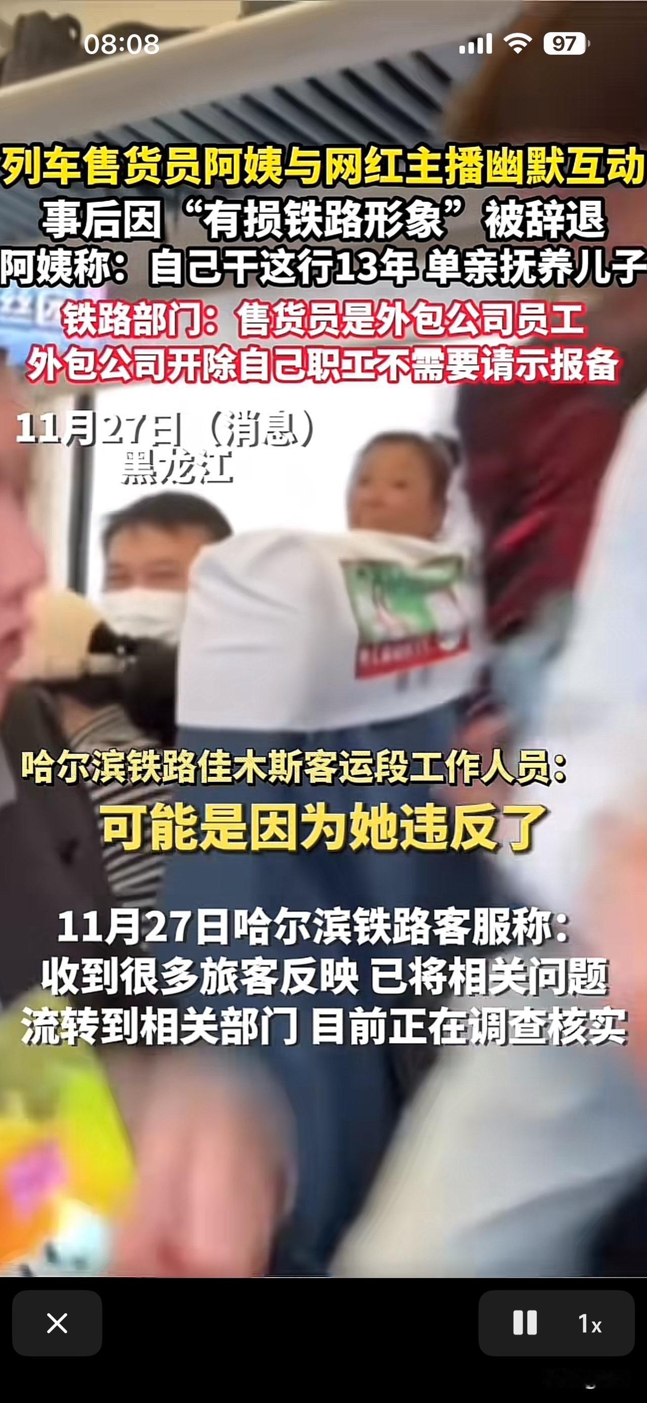 近期小编发现,在东北某列车上,售货员和某网红互动。被称“有损形象”被辞退。阿姨称:自己干了这行13年,单亲抚养儿子。 铁路部门:该员工是外包员工,外包公司开除自己员工不需要报备。后续公告澄清,没有被辞退,因人车分离有隐患,购物车会碰到乘客避免误伤,暂停2个班。 针对此事,哈尔滨铁路🚞告知,已将相关问题流转到相关部门。大家怎么看?列车乘务员叫卖