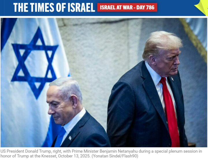 《以色列时报》报道中,特朗普10月在以色列议会的画面。