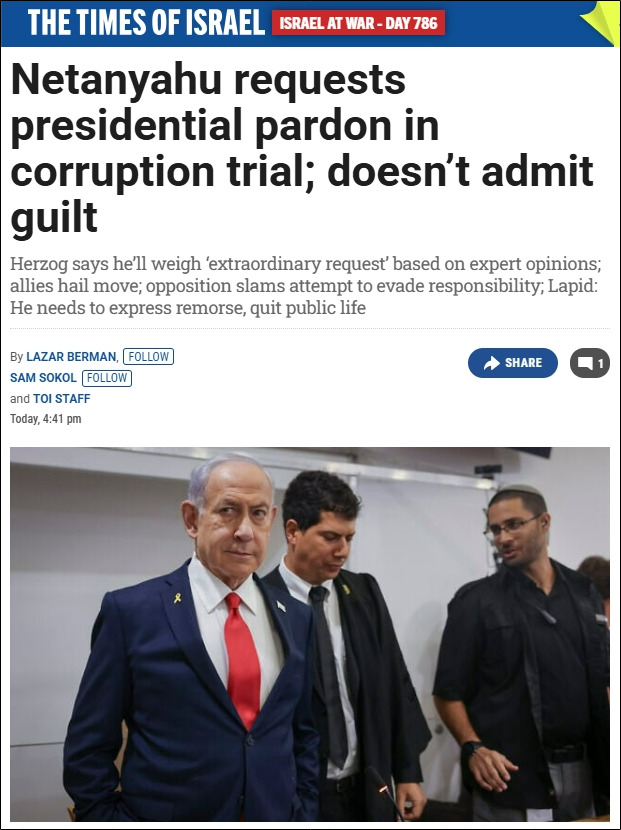 如今的赦免请求,标志着内塔尼亚胡的诉讼问题进入了一个新阶段。