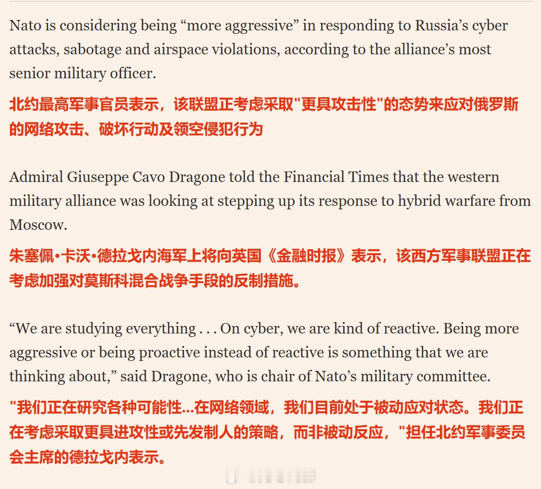 北约官员称,北约或对俄罗斯发动先发制人打击。该联盟首次讨论对俄罗斯发动先发制人打击以回应其“混合攻击”的可能性。北约军事委员会主席朱塞佩・卡沃・德拉贡海军上将向《金融时报》透露了这一消息。据该报报道,一些东欧外交官要求北约停止仅仅 “表达关切”,而是要做出回应。德拉贡承认,先发制人的行动可以被视为自卫,但这 “超出了传统思维”。他补充道:“或许我们应该比对手采取更激进的行动。问题在于法律框架和管辖权:谁来执行?”(欧洲自由派现在是拼命折腾展现自己的存在感,一天吼得比一天凶,这一边想给特朗普上眼药,一边又不敢真正直接挑战特朗普,就只能在俄罗斯这边加戏了,可惜了,最近这么关键的俄乌和平协议,他们连上桌的资格都没有 )海外新鲜事俄乌局势新进展 特朗普称美乌很可能达成协议