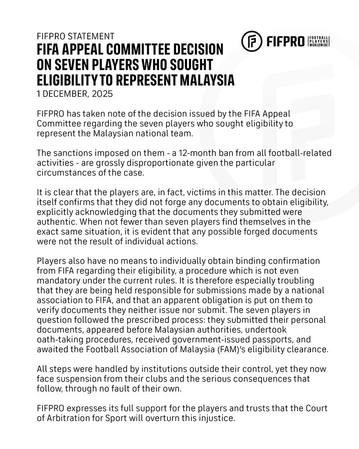 FIFPro在声明中写道:“国际职业足球运动员联合会(FIFPRO)已注意到国际足联上诉委员会就七名球员寻求获得代表马来西亚国家队资格一事所作出的决定。”