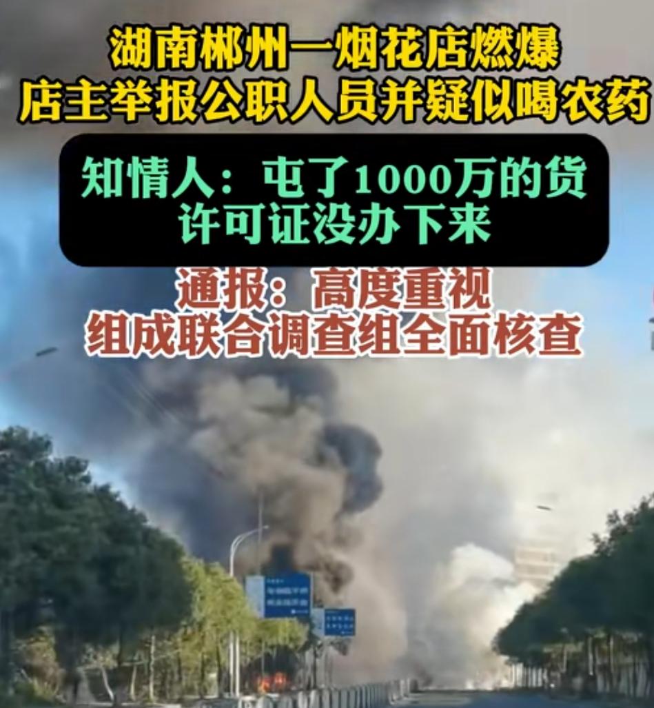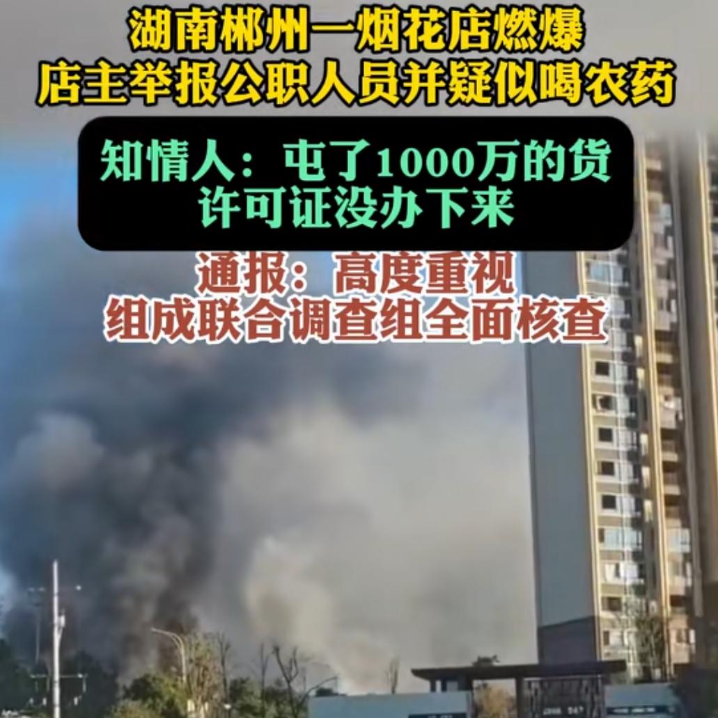 湖南郴州一烟花爆竹店店主 发视频举报公职人员,疑似喝下农药 并引爆了所有囤货 众所周知,烟花爆竹购买储存运输都是需要审批的,网传这店主囤了1000多万的货物,不是谁喝药谁有理,涉足这个需要许可证的行业,正常都会先把手续办下来再进货。 据说这行业要多个证:公安消防特殊许可证,烟花爆竹销售证,易燃易爆炸运输证以及安全存储证件,部分证件还要去参加考试。 店主能进这么大量的货,推断证以前是都能成功办理的,今年被卡住,大概率是先前说好了证能办下来,结果证办不了,这么多货不能卖压力太大。 也可能是某环节办证人员,职位变动换人了。看事发地点四周都是居民楼,可以肯定一点,周边及储存安全条件不达标准,因此不给办证也是情理之中。 简单来说,三点值得思考: 1、证没办就敢进1000万的货,盲目。 2、大量烟花爆竹存放在居民区,胆大。 3、烟花爆竹的存放、运输、零售都有严格规定,谁敢轻意批证。 既然举报采用实名,店主不该走极端以S相逼,想必确实是走投无路了,接近年关压了这么多货,很可能是贷款,填不上窟窿才会选择玉石俱焚… 郴州烟花事故 违规烟花爆竹