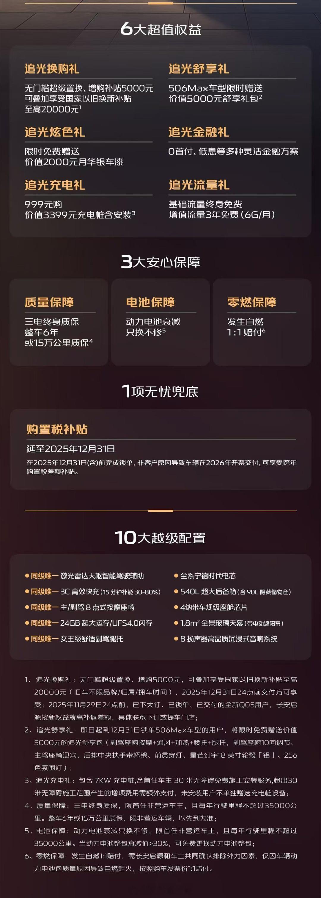 长安启源全新Q05,作为一台城市SUV以不到10万的价格就可选带激光雷达的版本,现在还享三电终身质保,整车6年或15万公里质保、电池衰减只换不修等一系列权益。而如果你只需要一台在城市里好开好用的纯电SUV,配合超级置换价,它仅需7.49w。这样的价格,大家觉得诚意如何?长安启源全新Q05