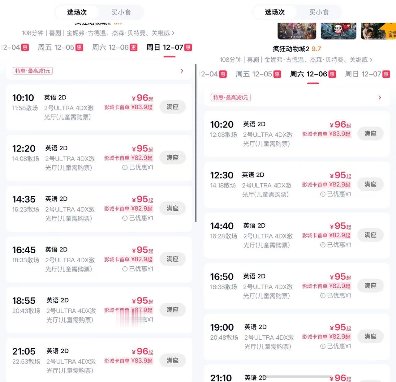 蓝鲸新闻记者查询发现,12月1日,《疯狂动物城2》占据78.1%排片的情况下,拥有91.2%的超高上座率。这一数据也在影院工作人员处得到佐证,一位上海某影院的工作人员告诉蓝鲸新闻记者,“最近真的是从早忙到晚,除了春节档那段时间很久没有这种感觉了”,该工作人员透露,目前影院基本上全天只排《疯狂动物城2》,“即便是工作日,很多场次的上座率都很高”。