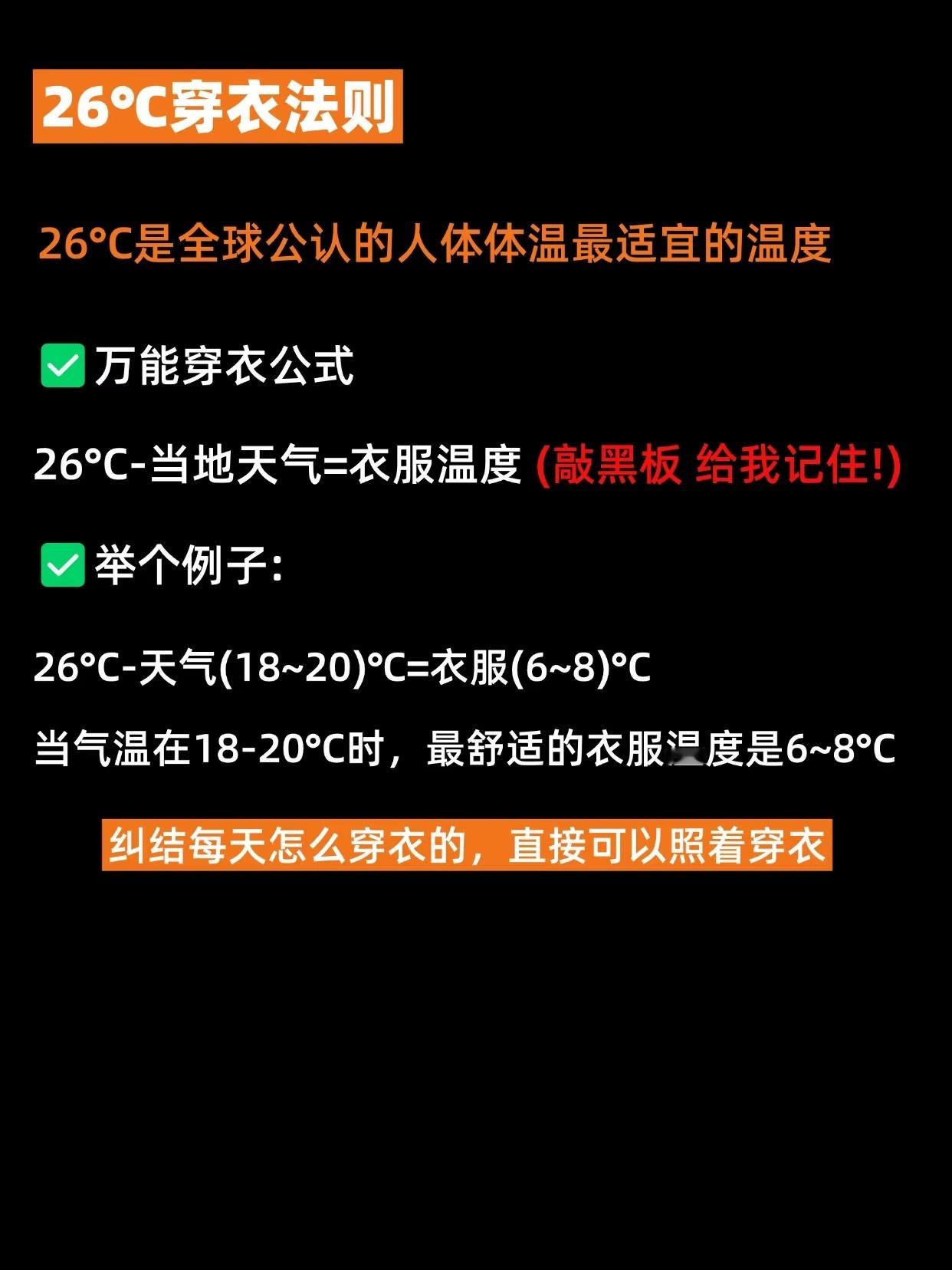 26度穿衣法则一个冷知识:公认的人体最适宜的温度26℃。记住这个傻瓜公式,从此告