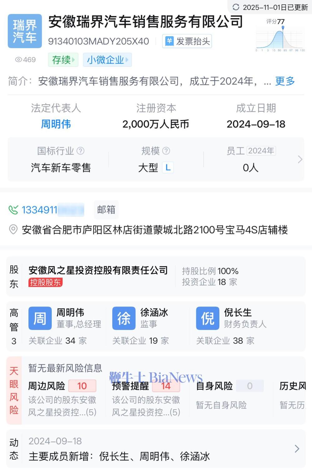 天眼查显示,安徽瑞界汽车销售服务有限公司,成立于2024年9月18日,注册资本2000万人民币,由安徽风之星投资控股有限责任公司100%持股。