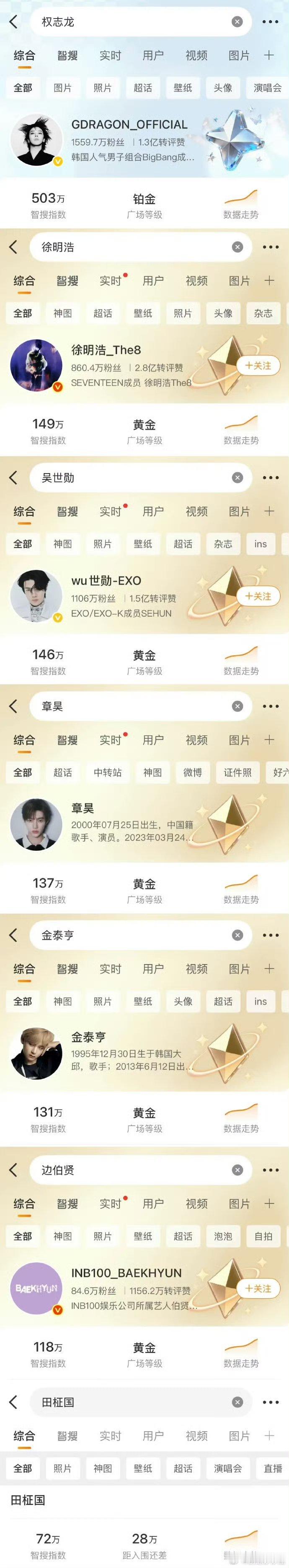 微博各爱豆大名广场等级女爱豆前五:宋雨琦 IU Lisa 张元英 Jennie男爱豆前五:权志龙 徐明浩 吴世勋 章昊 金泰亨