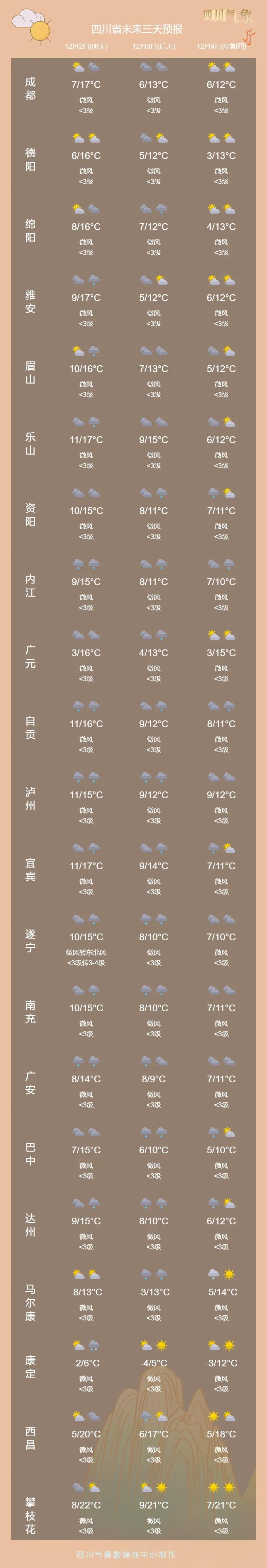 四川省气象台预计,12月5日至7日,盆地以多云天气为主。之后,9日至10日,盆地还有一次弱降温降水天气过程。