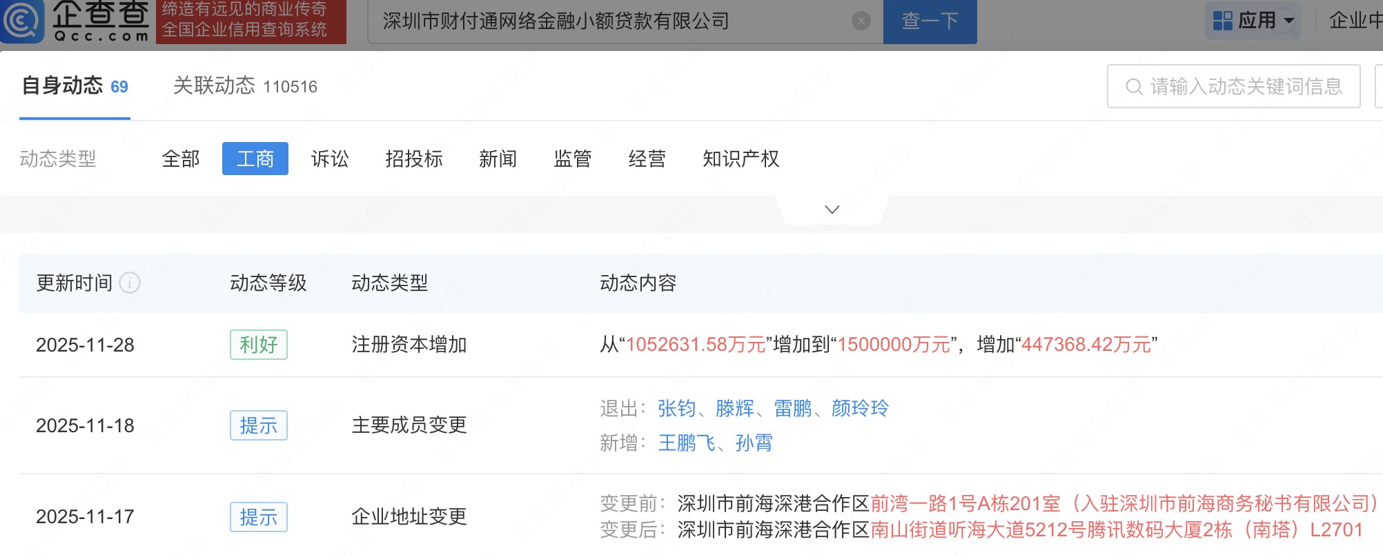 企查查APP显示,近日,财付通小贷关联公司深圳市财付通网络金融小额贷款有限公司发生工商变更,注册资本由约105.3亿人民币增至150亿人民币。企查查信息显示,该公司成立于2013年,法定代表人为杜西库,由深圳市腾讯网域计算机网络有限公司、深圳市腾讯计算机系统有限公司共同持股。