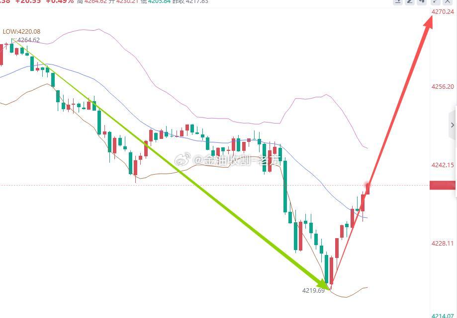 命是弱者的借口运是强者的谦词 黑色星期一行情随我心意今晚市场很给面子,走了一个教科书般的‘先空后涨’。尤其感恩的是,下方我们提前划好的4223支撑被精确测试并撑住反弹上来了。今晚的行情走势犹如砍瓜切菜般轻松惬意。一次预判正确,是市场给面子,也是我们交易系统的一次正常输出。在这个市场里,重要的不是一时的辉煌,而是如何持续、稳定地输出有价值的分析,并活得更久。 能在关键时刻为大家提供清晰的思路,陪伴大家一起看懂市场的变化,这是我作为分析师最大的价值。感谢市场的馈赠,也感谢兄弟们的信任与同行。今晚有按照计划做好风控的朋友,给自己点个赞吧!没跟上的也没关系,市场每天开门,我们下次一起。金价金油趋势实战大师-老方黄金如期走出趋势