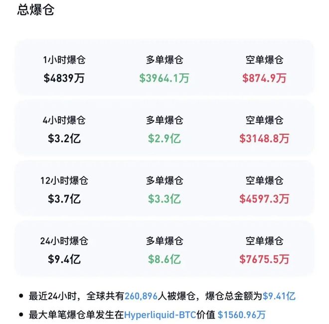 Coinglass数据显示,24小时内,爆仓人数超26万,爆仓总金额为9.41亿美元。