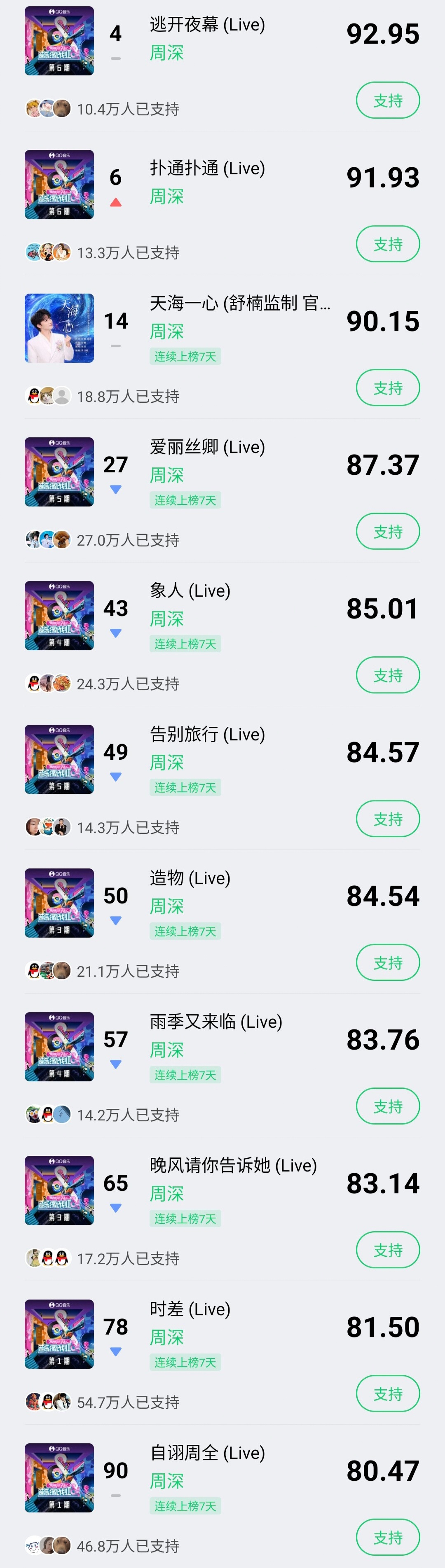 周深 📣 12.1 巅峰潮流 📣米米们晚上好每歌做6个动作路径:Q音-乐馆-排行-潮流巅峰✅《逃开夜幕(live)》✅《扑通扑通(live)》✅《天海一心》✅《爱丽丝卿(live)》✅《象人(live)》✅《告别旅行(live)》✅《造物(live)》✅《雨季又来临(live)》✅《晚风请你告诉她(live)》✅《时差(live)》✅《自诩周全(live)》完成『支持』让更多人听到深深