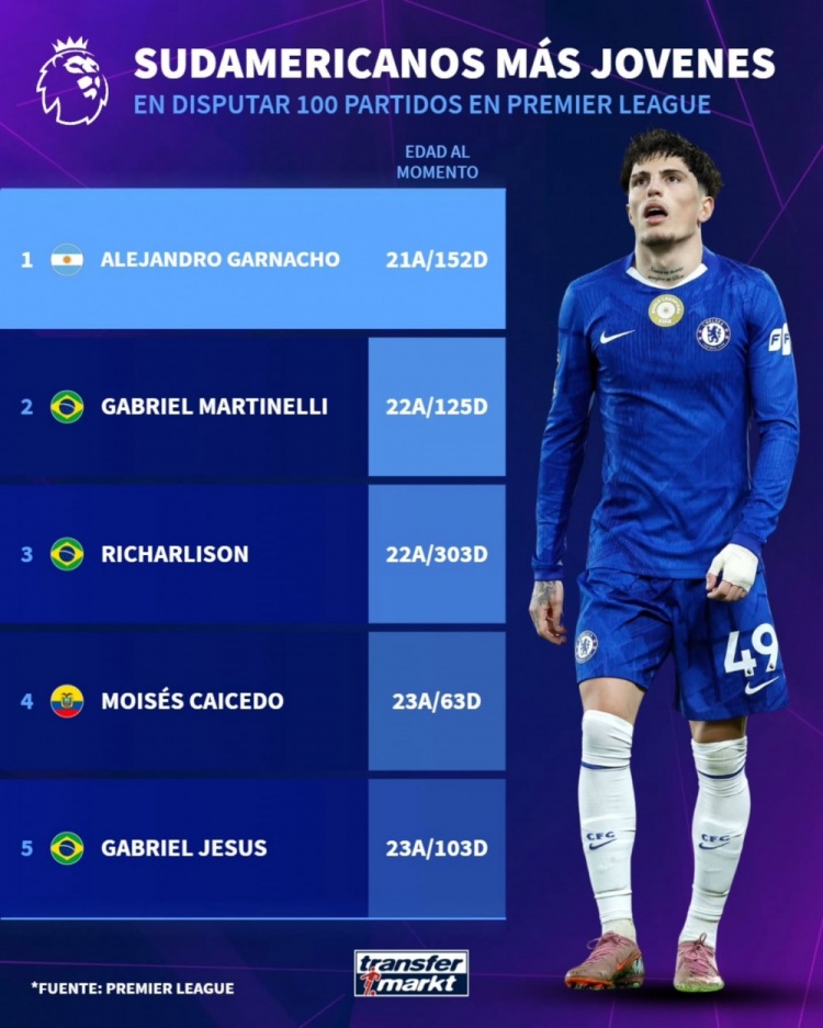 直播吧12月2日讯德国转会市场统计了南美球员出战100场英超比赛的年龄,并列出最年轻球员排名,加纳乔居首。