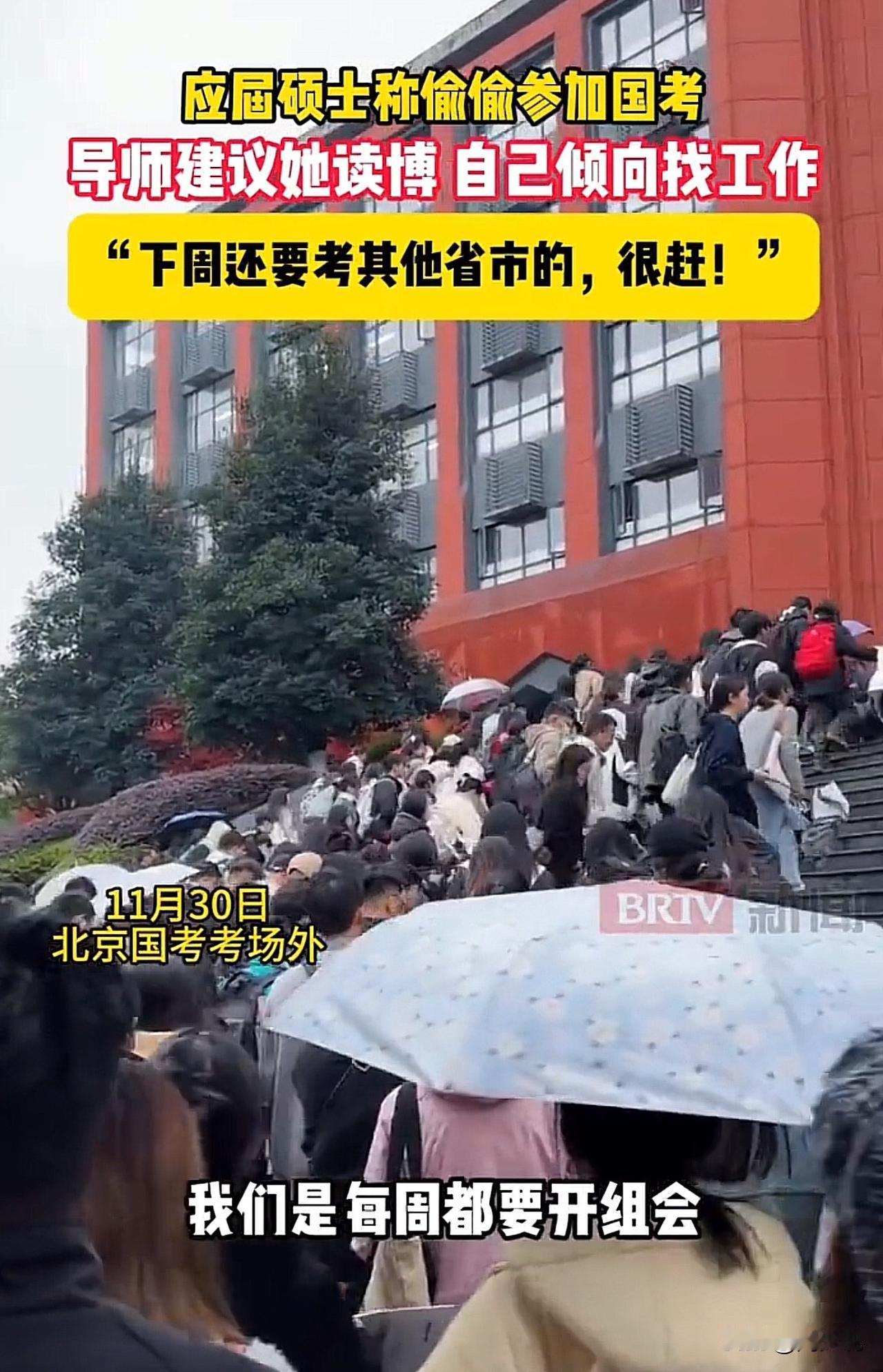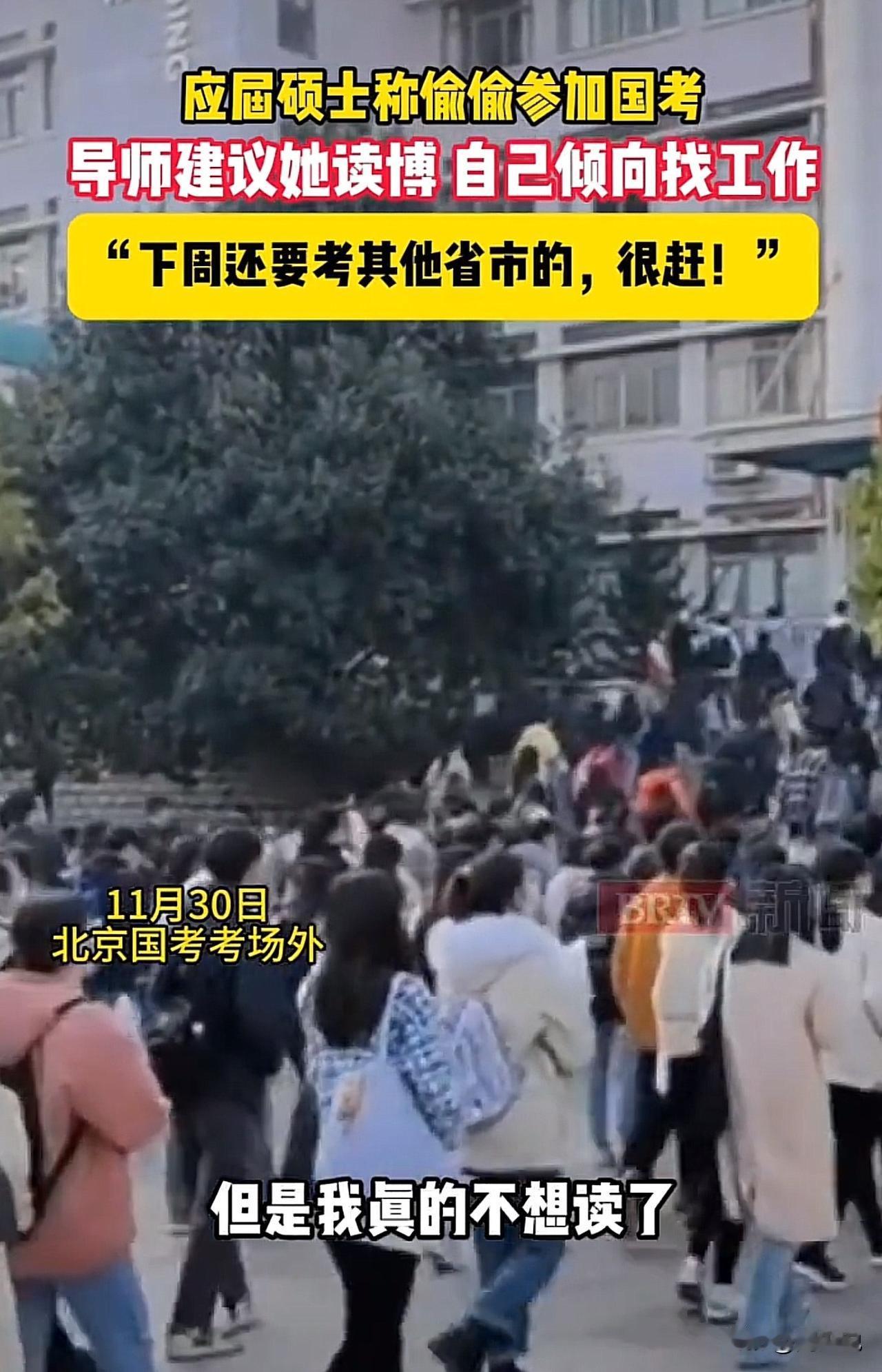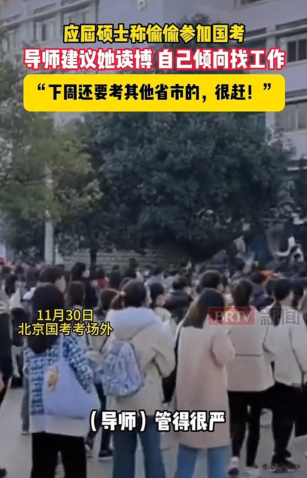 #应届硕士称瞒着导师偷偷参加国考#“太明智了!”北京国考现场,一位考生向记者透露:“自己不是很有时间,每周都要开组会,自己是偷偷摸摸准备的考试,没有跟导师说,导师管得很严。而且导师还建议读博士,但自己真的不想读了,下周还要考其他省市的,非常的赶!” 看完这位考生的话,客观的说,周少觉得考生非常的明智。当下博士扩招得非常的快,以现在的行情和经济状况,等到三五年博士毕业后找工作不一定比现在情况更好。 趁着现在有学习的拼劲,趁着这个机会,周少认为去尝试一下国考未必就是坏事。万一没有考上,也是一种经历,还可以继续准备读博士研究生。 对于这位考生的经历,大家觉得呢?#寻美三湘# #长沙新朋友#