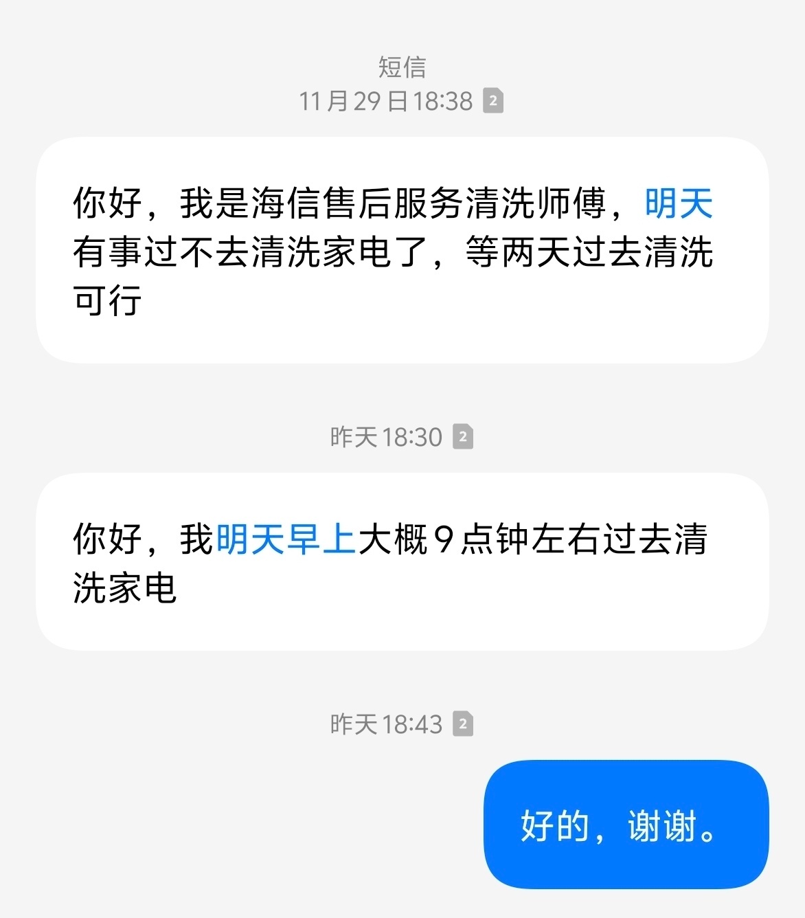 出国之前,想着把家里的油烟机一类清洗一下,从海信下单了清洁服务,结果第一次预约时间快到了师傅说有其他安排不过来了,第二次也就是今天上午,又出现了问题,不过来了。我今天晚上的飞机就去欧洲了,真离谱。