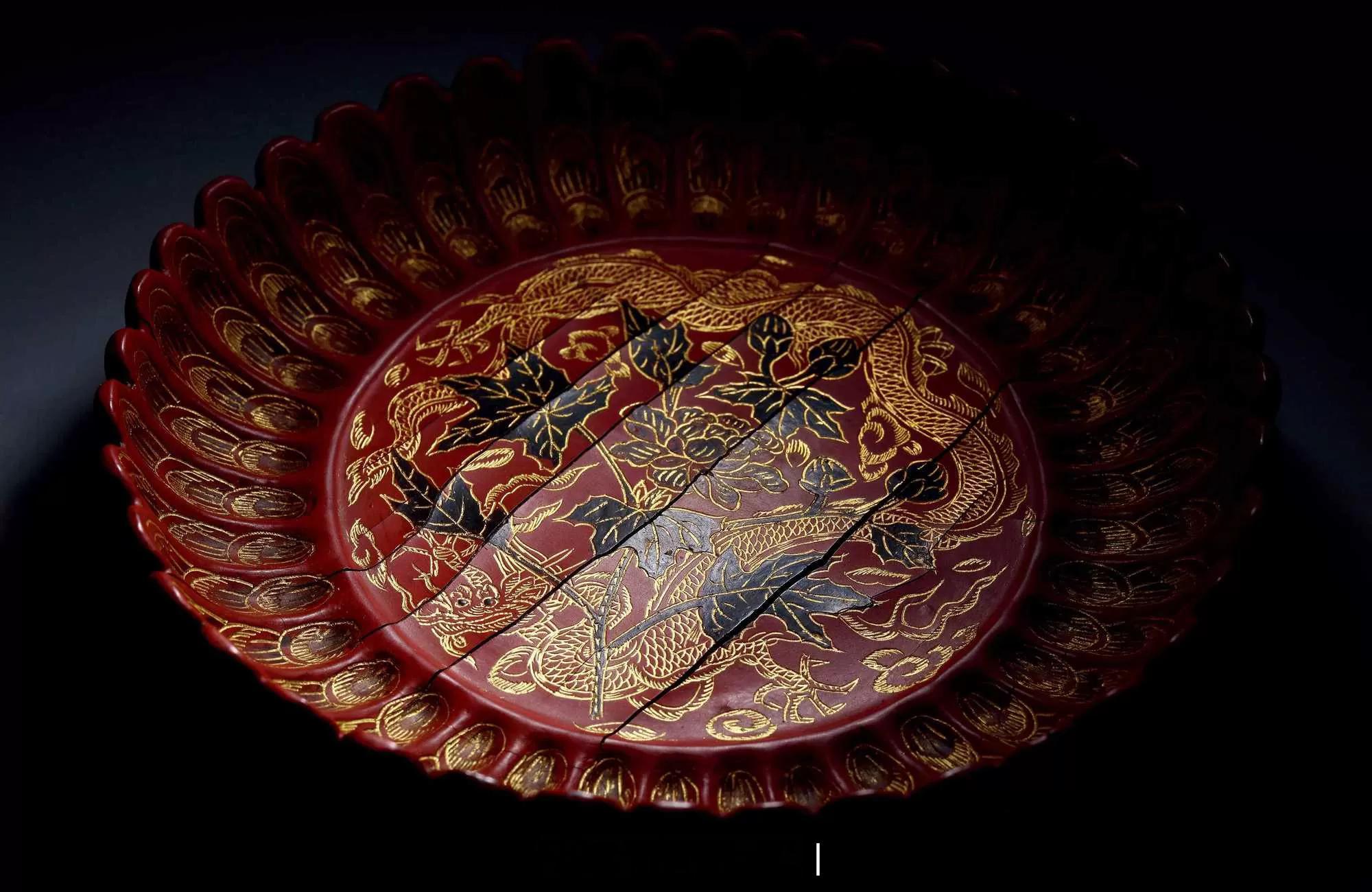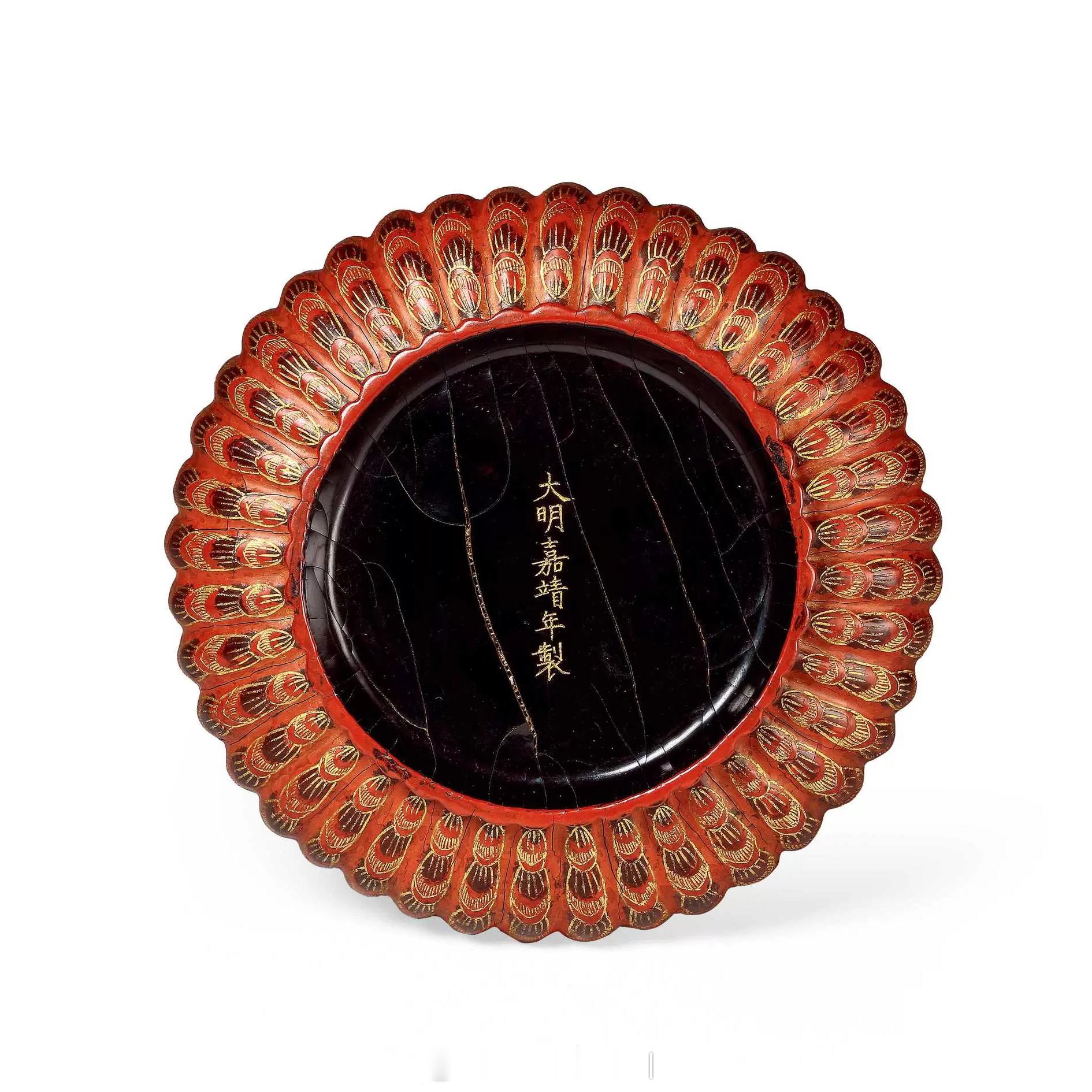 髹饰录 | 明嘉靖 彩漆戗金龙穿芙蓉花纹菊瓣盘菊瓣式盘,搁置案头如同一朵菊花盛开。红漆地,盘心图案是彩绘戗金与戗金两种工艺结合而成,与通体彩绘戗金的工艺不同,较为少见,图案装饰大气,明嘉靖时佳品。盘心彩绘戗金一株木芙蓉,叶片翻卷,花头丰硕,上有花蕾二,周匝则以戗金工艺饰盘龙纹游走于木芙蓉之周,游龙扁首闭嘴,四足蹬开,五趾,身躯蜿蜒,周匝云朵飘飘,富贵大气。盘壁菊瓣式,其上彩绘戗金卵状羽毛纹装饰。盘外壁弧突,圈足,每个花瓣上通饰卵状羽毛纹。盘底髹推光黑漆,中间竖向刻楷书款“大明嘉靖年制”,字口填金,字体稚拙大气,典型明代嘉靖时官款特征。尺寸:直径14.5cm来源:保利2025秋拍《醉花荫—海内外名藏漆器》