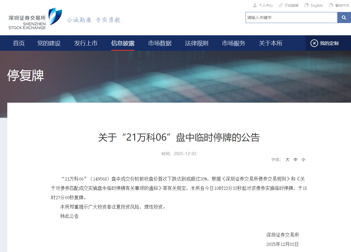 上证报中国证券网讯据深交所2日消息,“21万科06”(149568)盘中成交价较前收盘价首次下跌达到或超过30%,根据《深圳证券交易所债券交易规则》和《关于对债券匹配成交实施盘中临时停牌有关事项的通知》等有关规定,深交所自今日10时22分33秒起对该债券实施临时停牌,于15时27分00秒复牌。