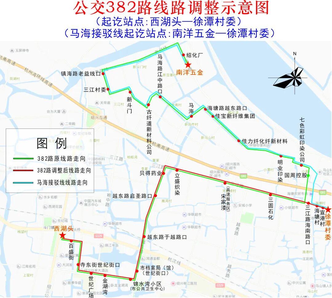 2.382路起讫站临时调整为“西湖头”至“徐潭村委”,临时新增停靠“三江路海南路口、海塘村、宣港村、徐潭村委”等4个站点,临时取消停靠“国周控股、七色彩虹印染公司、明业印染、佳力纤化纤新材料、佳宝新纤维集团、海塘路越东路口、马海、马海路江中路口、古纤道新材料公司、新斗门、三江村委、镇海路老益线口、绍化厂、南洋五金”等14个站点。